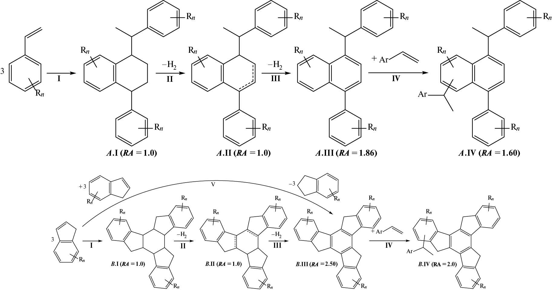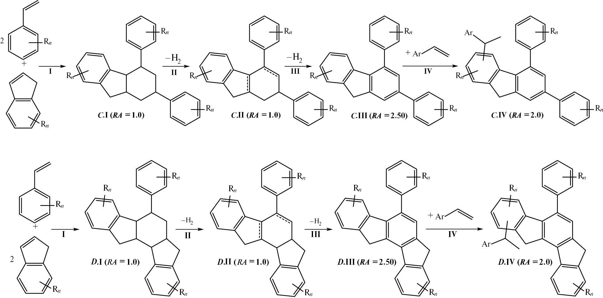 Олигомеризация производных стирола и индена имеет место как при пиролизе углеводородного сырья, так и при термической обработке ТСП, причем химизм процесса в обоих случаях во многом схож. На I стадии в результате тримеризации образуются конденсированные нафтеноароматические структуры с изолированными бензольными кольцами: A.I и B.I на рис. 6, C.I и D.I на рис. 7. Затем при высокой температуре пиролиза протекает ступенчатое дегидрирование нафтенов с образованием циклоолефинов (стадия II) и конденсированных ароматических ядер (стадия III). При этом из-за скоротечности пиролиза и последующей закалки реакционной смеси в продуктах накапливается значительное количество термодинамически наименее выгодных частично ненасыщенных кольцевых структур типа A.II или B.II (C.II, D.II).