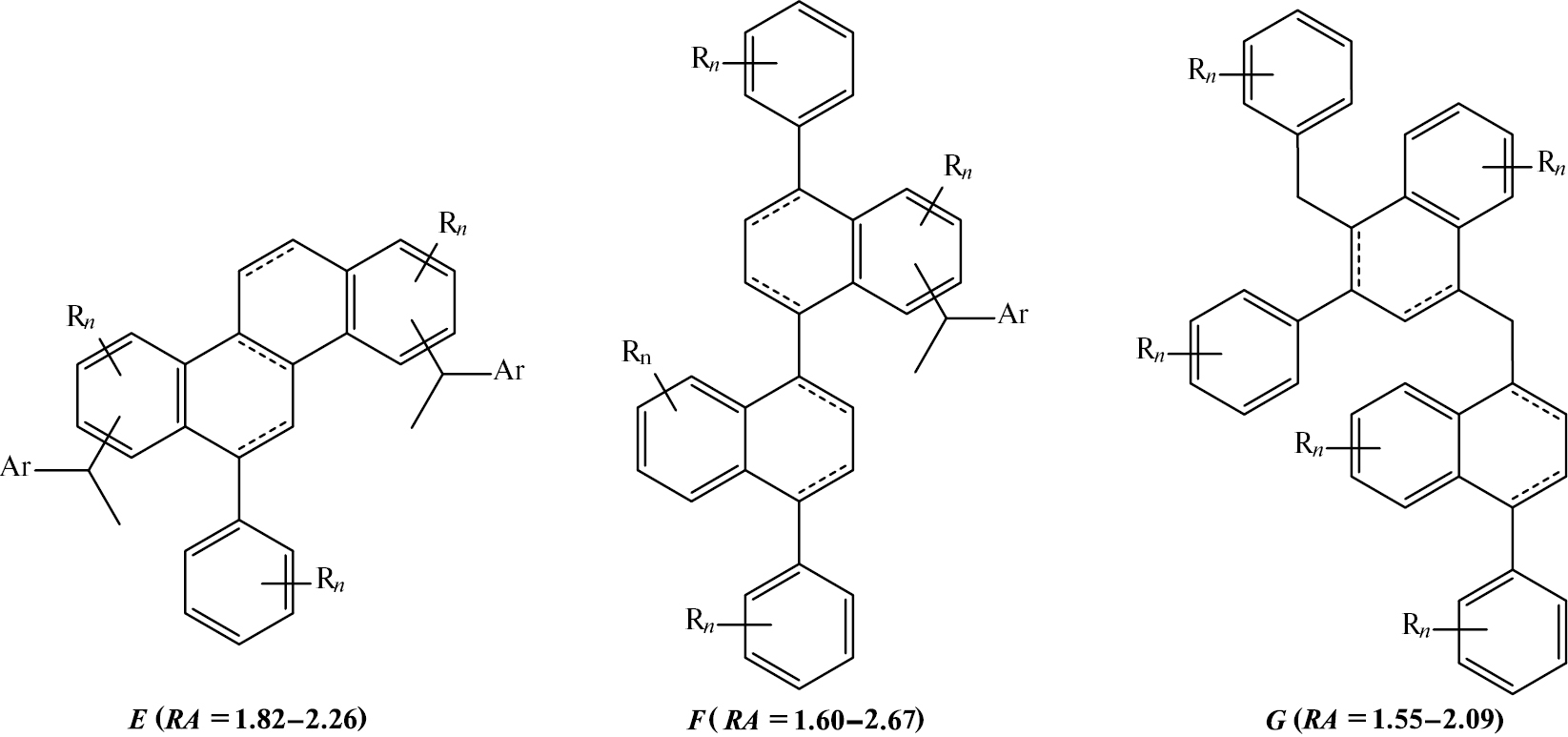 Рис. 8. Возможные структуры средних молекул асфальтенов на основе тримера (E), тетрамера (F) и пентамера (G) стирола: R — метил, этил; Ar — замещенный или незамещенный фенил; n = 0–2.
