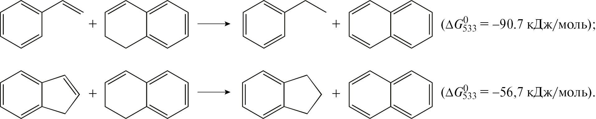 “Ядрами” молекул асфальтенов выступают производные тетралина разной степени дегидрирования, образованные в результате олигомеризации 3–5 винилбензолов. Труксеноподобные структуры в качестве ядра асфальтенов маловероятны, т. к. они получаются, главным образом, по сопряженным реакциям тримеризации и переноса водорода (стадия V, рис. 6). В условиях пиролиза реакция переноса водорода с циклогексанового кольца тримера на молекулу индена невозможна в силу того, что при температурах выше 630°C ее свободная энергия Гиббса принимает положительные значения.