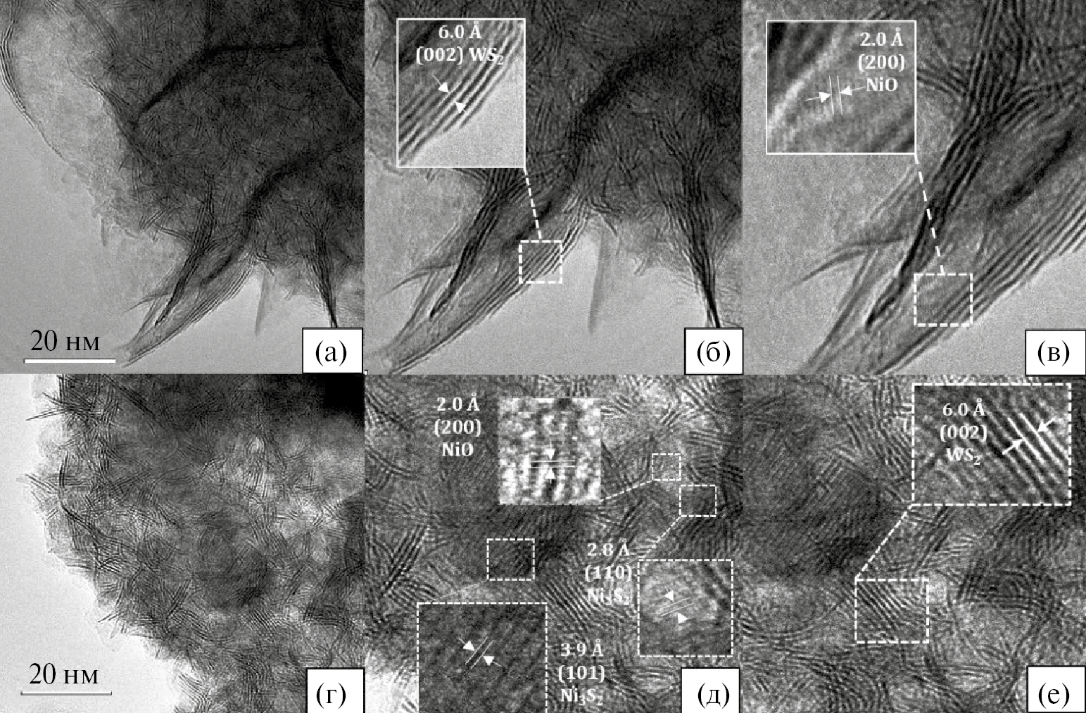 По данным метода ПЭМ, катализаторы характеризуются типичной для сульфидов слоистой структурой (рис. 4а–г). Межплоскостное расстояние 6.0 ± 0.1 Å указывает на базальную плоскость (002) фазы WS2 [39]. На микрофотографиях, полученных при высоком разрешении видны структуры с межплоскостным расстоянием 2.0 ± 0.1 Å (рис. 4в, д), что соответствует плоскости решетки (200) NiO [40], а также с расстояниями 2.8 ± 0.1 Å и 3.9 ± 0.1 Å (рис. 4д), соответствующим плоскостям (110) и (101) Ni3S2 [41].