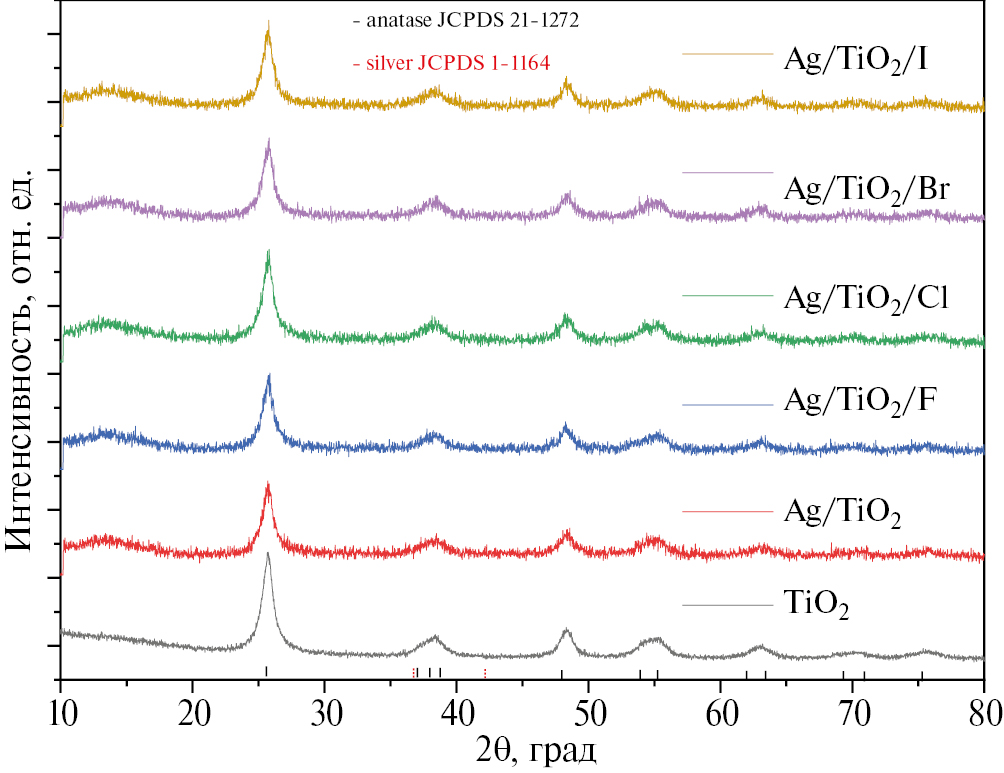 При изучении фазового состава полученных катализаторов наблюдались рефлексы диоксида титана со структурой анатаза (JCPDS No. 21–1272), анализ которых определил размер частиц TiO2 как ~8 нм (рис. 3). В свою очередь рефлексов от кристаллического серебра обнаружено не было, так как количество Ag (~0.1 ат.% по данным РСМА, табл. 1) недостаточно для идентификации металла данным методом. Площадь удельной поверхности всех полученных катализаторов составила ~300 м2/г. Спектроскопия диффузного отражения показывает небольшой сдвиг края полосы поглощения в видимую область спектра по отношению к образцу сравнения.