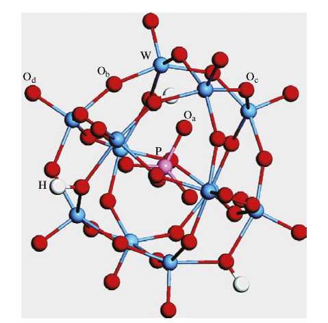 Первичная структура ГПК устойчива, в ней центральный атом P окружен 12 октаэдрами металл–кислород (WO6) [27]. Анион ГПК несет отрицательный заряд 3–, который создается гидроксильными группами, расположенными на поверхности структуры. В структуре молекулы ГПК имеется четыре типа атомов кислорода: 4 центральных атома кислорода (Oa), 12 атомов кислорода, соединяющих между собой два атома вольфрама, связанных в свою очередь с центральным атомом кислорода (Oc с общим ребром), 12 атомов кислорода, соединяющих между собой атомы вольфрама, не связанные с центральным атомом кислорода (Ob), и 12 терминальных атомов кислорода (Od), связанных с одним атомом вольфрама (рис. 1).