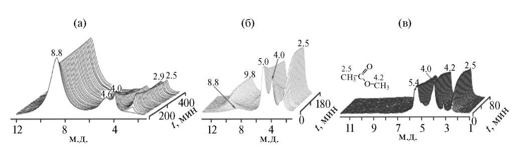 Рис. 7. Стековый график 1H MAS ЯМР спектров: а) при 453 К ДМЭ, адсорбированного на H3PW12O40 и реагирующего с CO. Начальный спектр записан через 5 мин после достижения температуры 453 K, конечный спектр записан после 400 мин реакции; б) при 449 K ДМЭ, адсорбированного на Rh/Cs2HPW12O40 и реагирующего с CO. Начальный спектр записан через 5 мин после достижения температуры 449 К, и конечный спектр записан после 180 мин реакции; в) при 482 K ДМЭ, адсорбированного на Ag/Cs2HPW12O40 и реагирующего с CO. Начальный спектр записан через 2 мин после достижения температуры 482 K, и конечный спектр записан после 80 мин реакции (по [38, 66]).