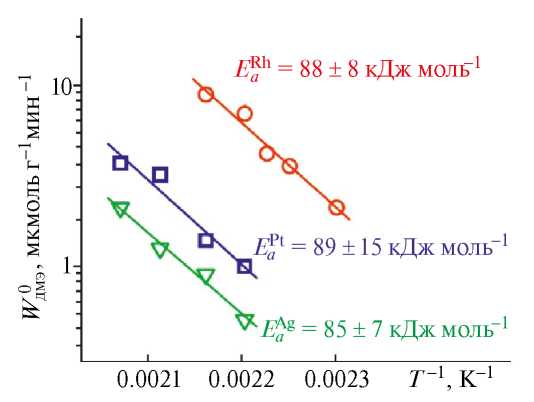 Для приготовленных образцов была оценена температурная зависимость начальной скорости реакции (W0ДМЭ) для определения энергии активации (рис. 8).