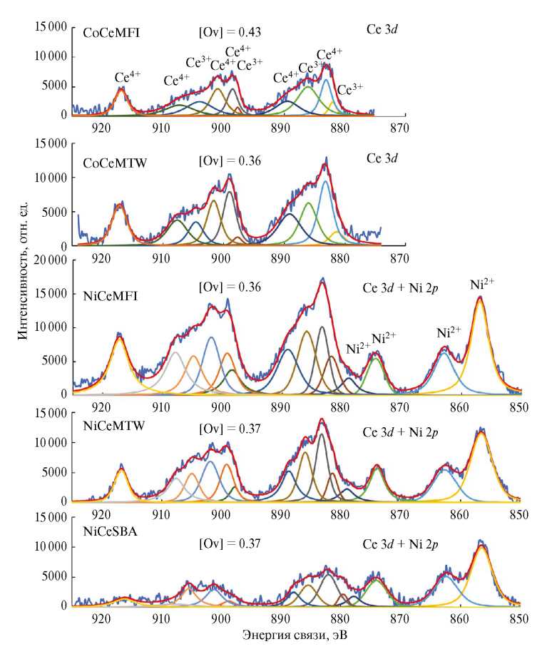 Для анализа электронного состояния атомов на поверхности образцов было проведено регистрирование рентгеновских фотоэлектронных спектров атомов Ce (3d) и Ni (2p). Как следует из результатов анализа (рис. 3), на спектре Ce3d после деконволюции присутствуют следующие пики: u''' (917 эВ), u'' (907 эВ), u (901 эВ), v''' (898 эВ), v'' (888 эВ), v (882 эВ), которые относятся к Ce4+ (CeO2), и пики u' (904 эВ), u0 (898 эВ), v' (885 эВ), v0 (880 эВ), которые относятся к Ce3+ (Ce2O3). Исходя из площадей пиков Ce4+ и Ce3+ рассчитывалось содержание кислородных вакансий (Ov) как соотношение [Ov] = Ce3+/(Ce3++Ce4+). Как следует из рассчитанных данных, содержание Ov составляло 0.36–0.37 во всех образцах, за исключением CoCeMFI, в котором рассчитанное количество Ov составляло 0.43. Следует отметить, что содержание CeO2 в образце NiCeSBA было наименьшим (исходя из суммарной площади пиков) среди всех образцов. Предположительно это связано с мезопористой структурой материала носителя (SBA-15) и частичным внедрением CeO2 внутрь пор. Исходя из спектральных данных, Ni в основном содержался в образцах в степени окисления 2+.