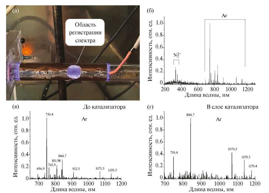 Для in situ характеризации процесса гидрирования CO2, была проведена регистрация оптических спектров в видимом диапазоне длин волн. Для регистрации спектров конструкция реактора была изменена: материал внешнего электрода был заменен на медную фольгу; на поверхности электрода было вырезано отверстие (рис. 6а). Спектры регистрировали в разных областях: в области разряда до катализатора и в слое катализатора. На обзорном спектре (рис. 6б) наблюдаются полосы второй положительной системы N2 (два максимума при 336 и 357 нм). Появление данных линий на спектре связано с излучением вне ректора по окружности отверстия во внешнем электроде. За исключением N2, остальные атомарные линии на спектрах характерны для Ar, при этом выделяются две линии с наибольшей интенсивностью: 750.4 и 844.7 нм (рис. 6в). При регистрации спектра в зоне катализатора интенсивность линии 750.4 нм резко снижается, что связано со значительным снижением интенсивности свечения разряда в области расположения катализатора в реакторе (рис. 6г). Следует отметить, что сигналов, соответствующих другим атомам, помимо указанных N2 и Ar, в спектрах не наблюдалось. По всей видимости, концентрация диссоциированных молекул H2 была мала вследствие относительно невысокой поглощаемой мощности в реакторе (~20 Вт). Таким образом, для детектирования промежуточных частиц необходимо повышать мощность разряда, а также снижать содержание Ar в смеси.