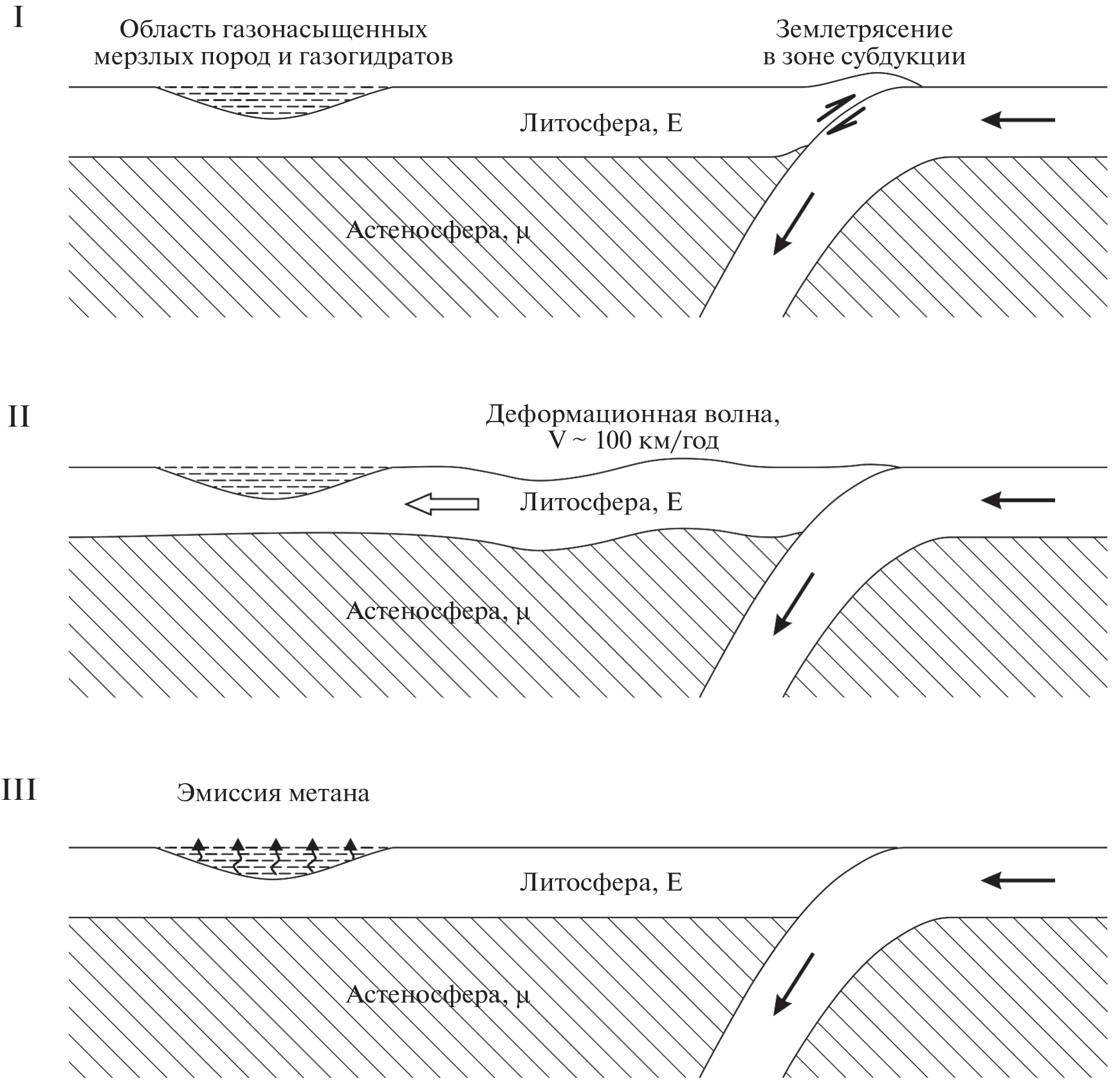 - Lobkovsky L.I., Baranov A.A., Ramazanov M.M., Vladimirova I.S., Gabsatarov Y.V., Semiletov I.P., Alekseev D.A. Trigger Mechanisms of Gas Hydrate Decomposition, Methane Emissions, and Glacier Breakups in Polar Regions as a Result of Tectonic Wave Deformation. Geosciences. 2022. V. 12(10). P. 372.
