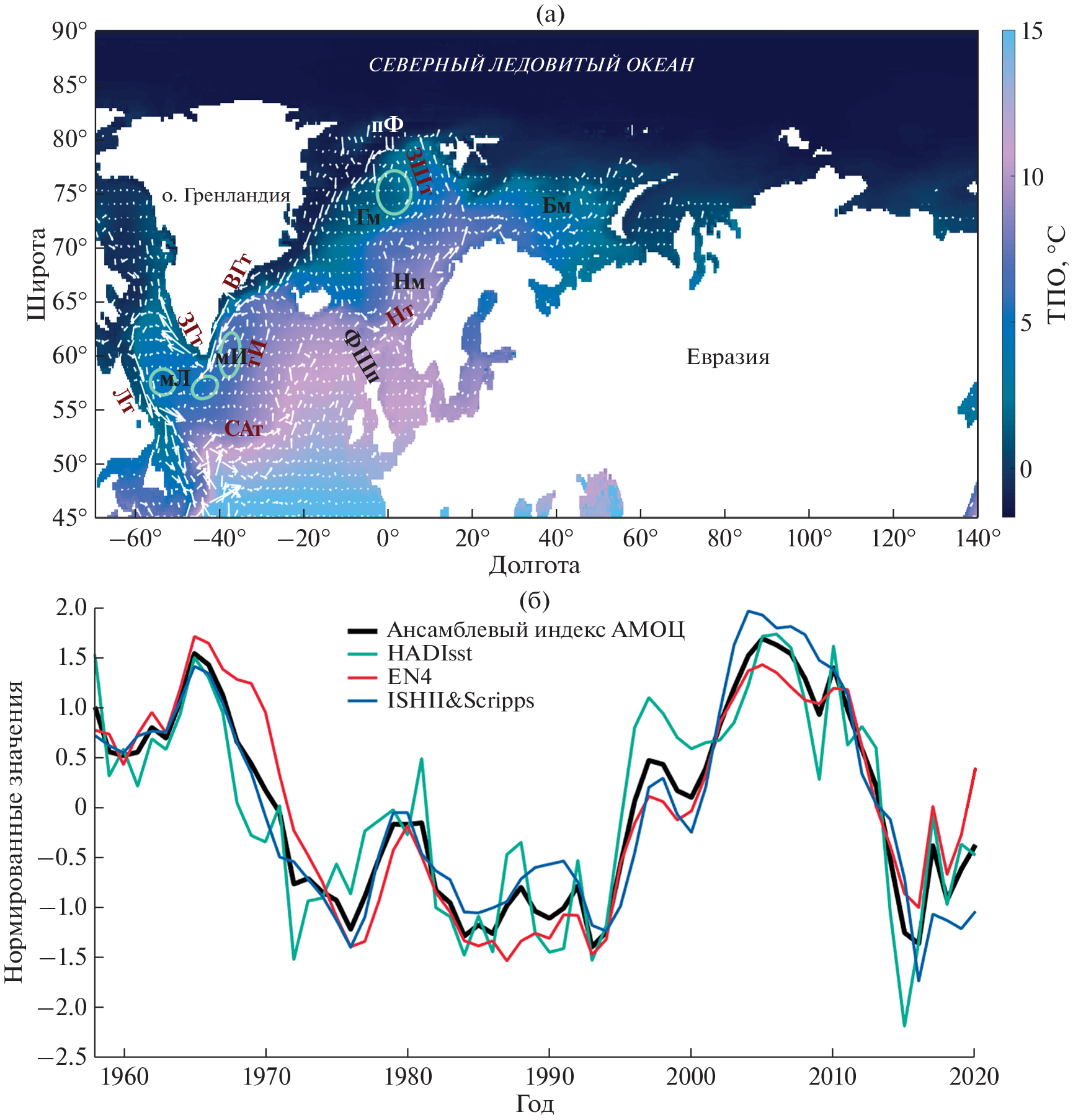 - Кузнецова Д.А., Башмачников И.Л. О механизмах изменчивости Атлантической меридиональной океанической циркуляции (АМОЦ) // Океанология. 2021. Т. 61. № 6. С. 843–855. https://doi.org/10.31857/S0030157421060071