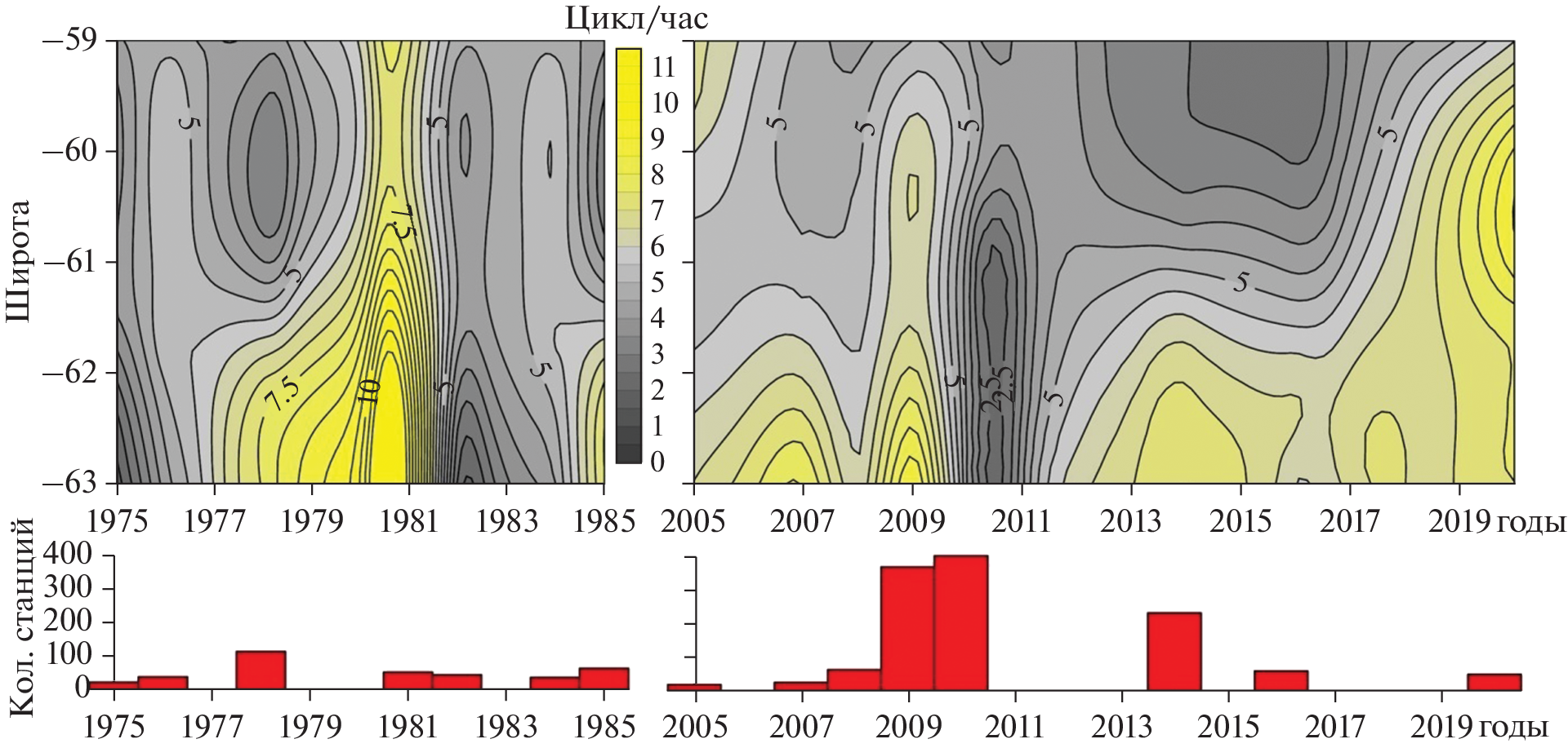 The trend assessment of the dynamic state of the Powell Basin waters in the Weddell Sea was made on the basis of the hydrological data of the 79th cruise of the R/V AkademikMstislavKeldysh (January 16–February 6, 2020) and the World Ocean Database-2018 data for January-February from 1975 to 2020. At each node of the quarter-degree grid, a linear trend was constructed for the calculated values of the maximum buoyancy frequency and the maximum amplitude of the vertical component of the internal wave velocity. It is shown that the southwestern and northwestern parts of the Powell Basin differ significantly in their hydrophysical characteristics. In the northwest of the basin, the linear trend of the maximum buoyancy frequency is negative, the trends of the depths of the maximum values of the Väisälä-Brent frequency and the amplitude of the vertical velocity component are positive. In the southwestern part of the basin, the opposite is true: the trend of the maximum buoyancy frequency is positive, the trends in the depths of the maximum values of the Väisälä-Brunt frequency and the amplitude of the vertical velocity component are negative.