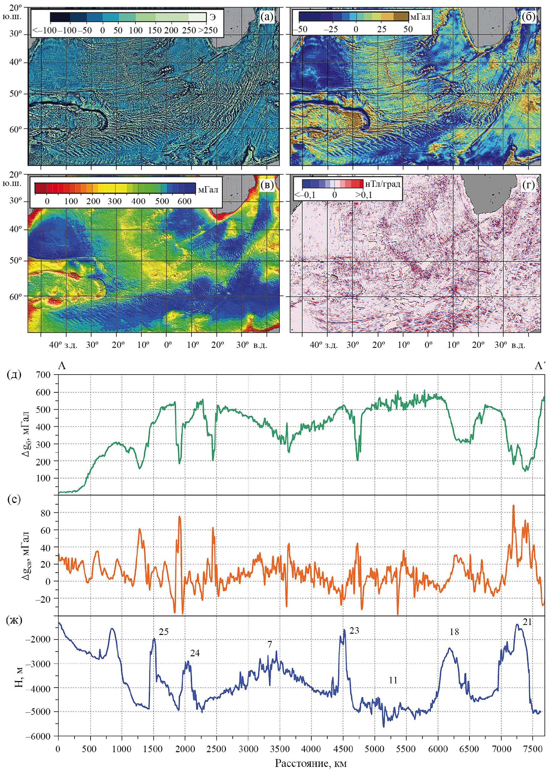 Рис. 2. Геофизические характеристики района исследований. а–г — по площади: а — вертикальный гравитационный градиент [58], б — карта аномального поля силы тяжести в свободном воздухе [58], в — карта аномального поля силы тяжести в редукции Буге [3], г — градиент аномального магнитного поля по данным [49], д–ж — на профиле А–А′ (расположение профиля см. на рис. 1): д — график аномального поля силы тяжести в редукции Буге, е — график аномального поля силы тяжести в свободном воздухе, ж — рельеф дна вдоль трансатлантического профиля по данным [72]; номера структур вдоль профиля указаны в соответствии с рис. 1