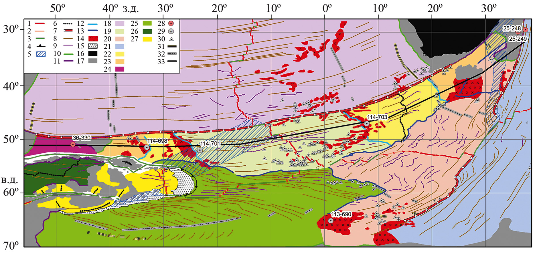 Рис. 3. Схема тектонического районирования литосферы, построенная на основе данных глобальных гридов и компиляций [47, 49, 58, 62]. На рисунке показаны: 1–5 – активные границы плит: 1 – ось спрединга; 2 – нетрансформные смещения; 3 – трансформные разломы; 4 – зона субдукции; 5 – диффузные границы плит; 6–8 – древние границы плиты: 6 – оси палеоспрединга, 7 – следы демаркационных трансформных разломов, 8 – внеосевые следы трансформных разломов; 9 – внеосевые следы нетрансформных смещений; 10, 11 – континентальные окраины: 10 – рифтогенные, 11 – сдвиговые; 12 – шовные зоны, обусловленные перескоками оси спрединга; 13 – следы продвижения спрединговых хребтов — псевдоразломы; 14 – магматические поднятия; 15 – островные дуги; 16 – массивы континентальной коры; 17 – массивы утоненной континентальной коры; 18–27 – различные по происхождению массивы океанической коры, сформированные на разных спрединговых хребтах: 18 – САХ, 19 – ЮСАХ, 20 – западного сегмента ЮЗИХ, 21 – восточного сегмента ЮЗИХ, 22 – хребта Мальвинес, 23 – хребта котловины Транскей, 24 – Фолклендского бассейна, 25 – спрединговых хребтов моря Уэдделла, 26 – хребта Западный Скотия, 27 – бассейнов центральной и восточной части моря Скотия; 28–33 – прочие обозначения: 28 – скважины проекта DSDP, 29 – скважины проекта ODP, 30 – подводные горы, 31 – ЛМА М0, 32 – ЛМА С34, 33 – линия профиля А-А′, показанного на рис. 1
