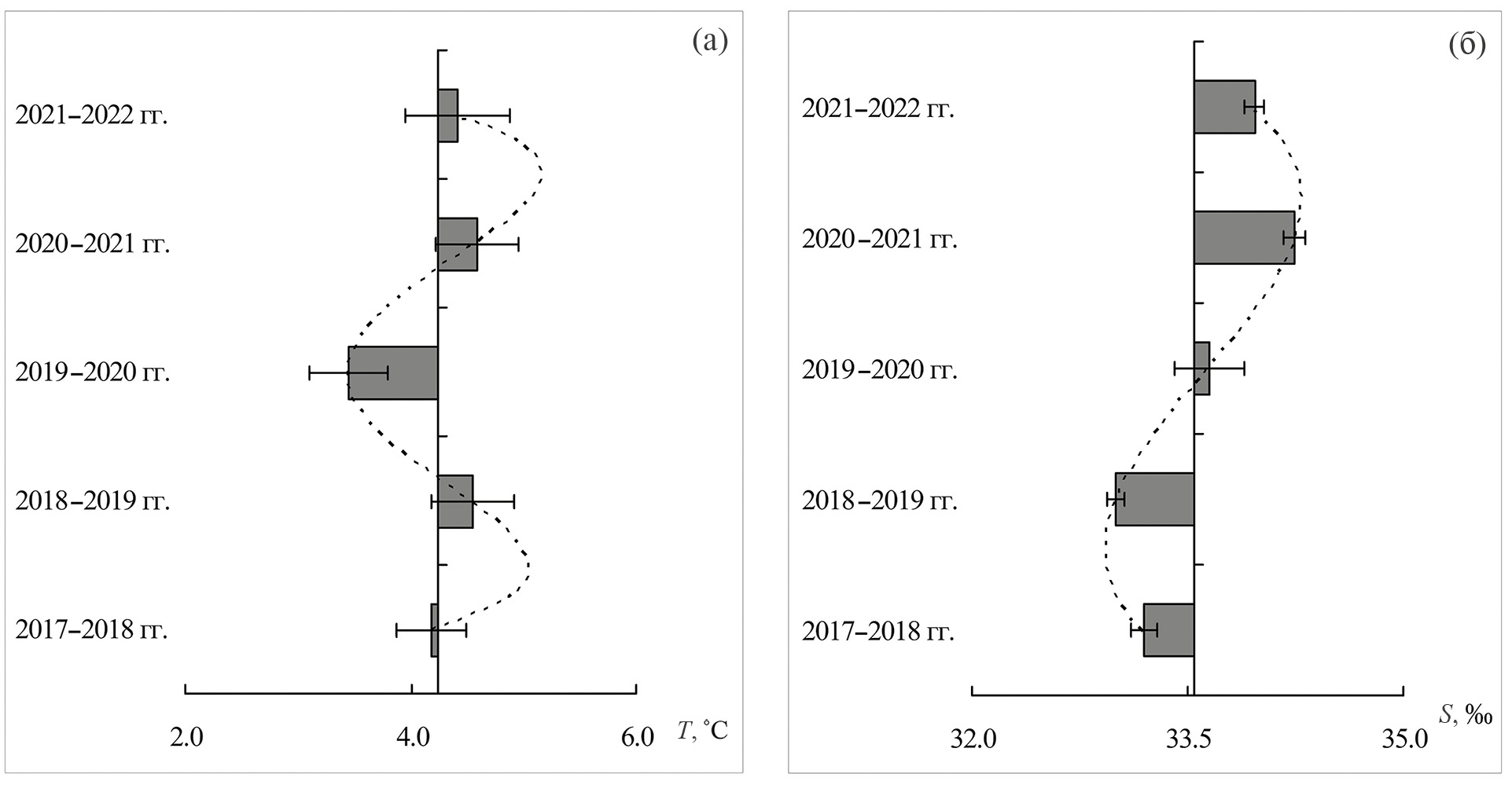 Необходимо отметить, что изменения солености и температуры воды в 2017–2020 гг. происходили асинхронно (снижение температуры воды сопровождалось повышением солености и наоборот), а в 2019–2022 гг. те же изменения происходили синхронно (температура воды снижалась и уменьшалась соленость, температура повышалась — соленость увеличивалась) (см. рис. 2а, б).