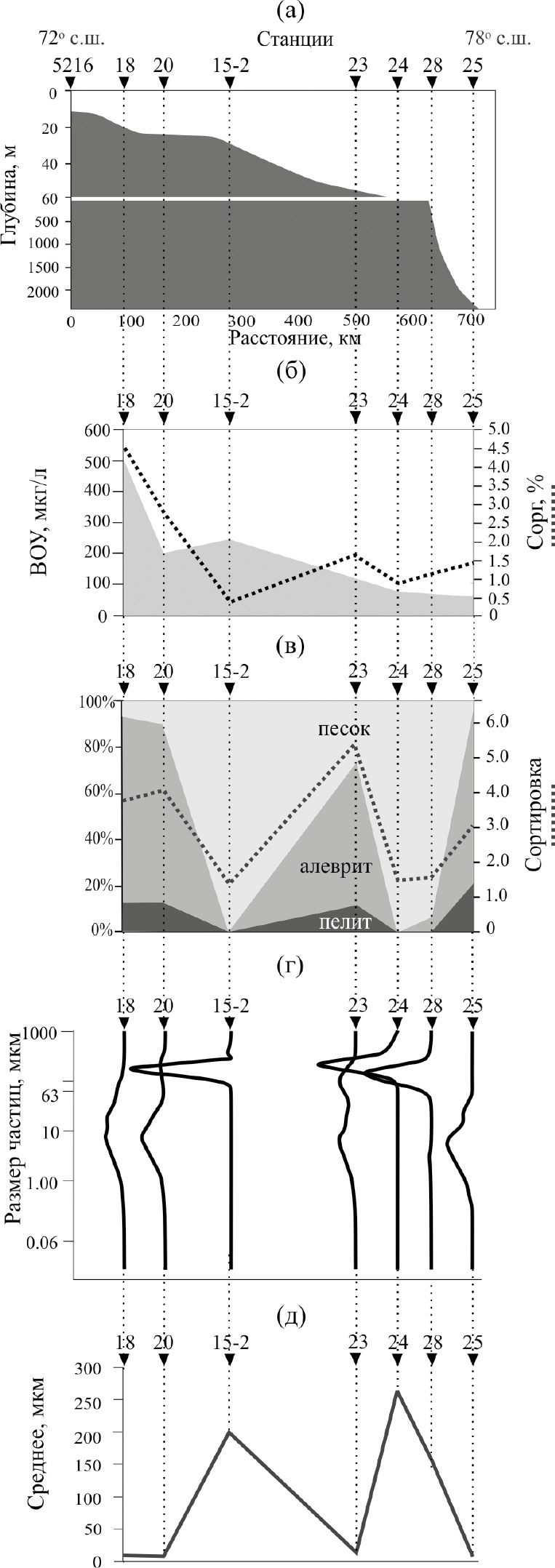 Из результатов изучения гранулометрического состава донных осадков следует, что из р. Лены выносится хорошо сортированный грубозернистый материал, характеризующийся низким содержанием Сорг (рис. 4а). На изменение гранулометрического состава осадков и степени их сортировки на изученном разрезе помимо влияния стока р. Лена могла оказывать влияние эрозионно- аккумулятивная деятельность придонных течений. Полученные данные подтверждают значительную латеральную изменчивость условий осадконакопления в районе исследования. Выявлены существенные вариации гранулометрического состава осадков на изученном разрезе. В частности, обнаружены участки дна, на которых содержание песка в осадках достигает 100% (рис. 4б). Распространение песков на шельфе в районе исследования также было описано в работах [28, 32]. Изменения гранулометрического состава наилка (0–0.5 см) повторяют характер вариаций состава поверхностных осадков на изученном разрезе (табл. 4).