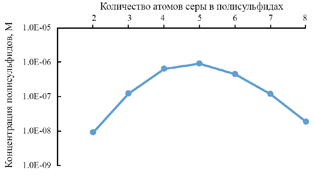 В результате мы получим, что наиболее распространенным полисульфидом является пентасульфид. Распространенность полисульфидов с длиной цепочек n = 4–6 в 10–100 раз больше остальных (рис. 8). Расчетные концентрации полисульфидов (n = 4–8) растут пропорционально концентрации сероводорода и достигают 2.1 мкМ в сумме при содержании сульфида 200 мкМ на глубине 600 м. Это в 3 раза выше наших максимальных результатов — 0.67 мкмоль/кг. Рассчитанная концентрация полисульфидов равна данным определений ZVS при концентрации сероводорода меньше 10 мкМ в зоне интенсивного окисления сероводорода (рис. 7). Глубже 20–25 м от редокс интерфейса концентрация ZVS становится меньше рассчитанной в виде полисульфидов. Полисульфиды весьма активно участвуют в процессах преобразования форм серы, их пониженное количество может быть связано с их потреблением в толще сероводородной зоны, а не с низкой скоростью образования [9].
