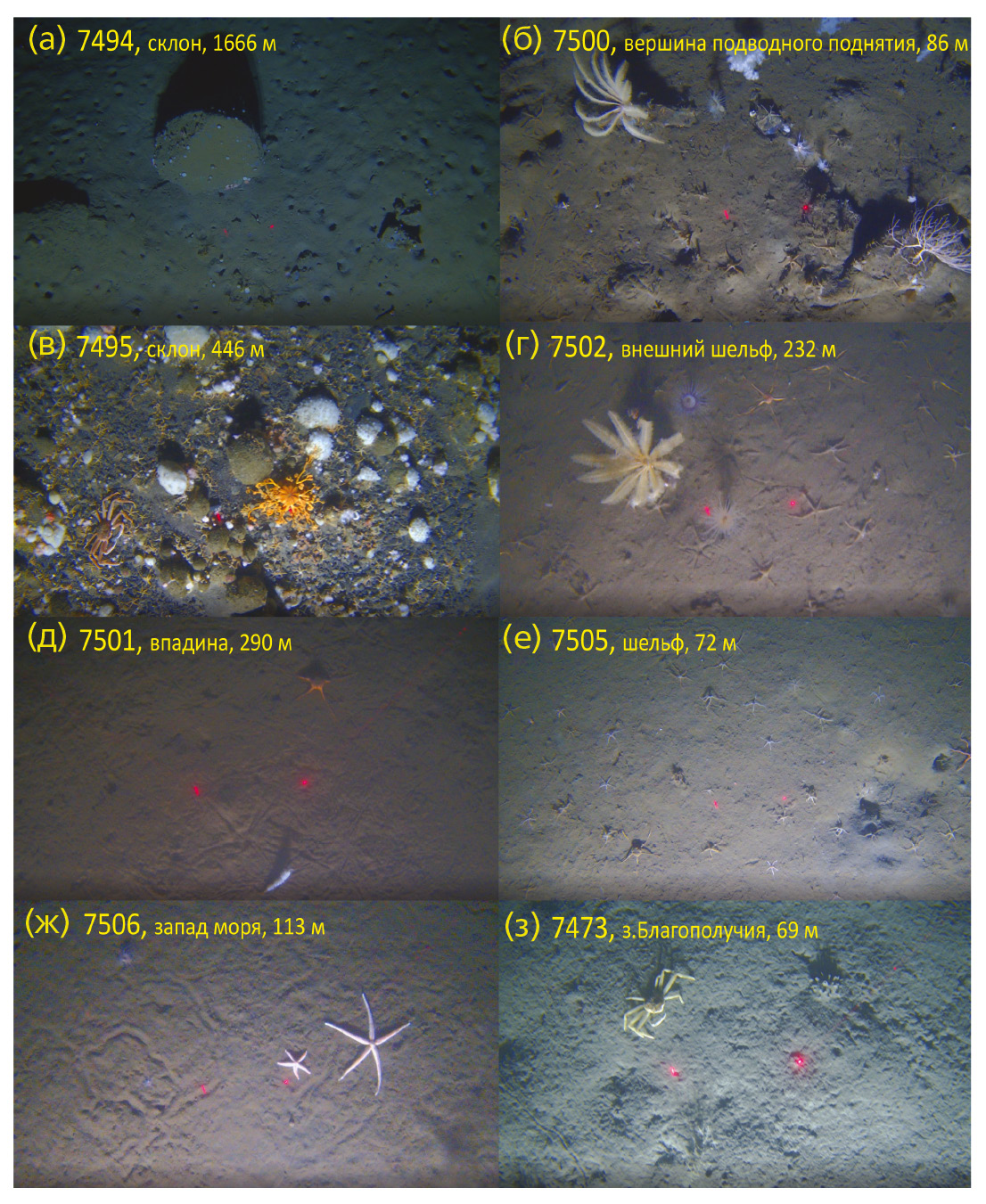 На дне часто наблюдаются следы гидродинамической активности, высока доля твердых субстратов, выходов коренных пород, камней, гальки, населенных богатой фауной сестонофагов. Дно обычно сильно биотурбировано, отмечено большое количество следов жизнедеятельности организмов, следов ползания, скопления нор, поселений трубкообразующих полихет. Общая плотность крупных организмов мегафауны здесь достаточно высока, на шельфе она меняется от 4.4 экз/10 м2 (в илистой депрессии на глубине 290 м, ст. 7501) до 373 экз/10 м2 (70 м, ст. 7505) и составляет в среднем 140 экз/10 м2. Станции склона стоят особняком, наибольшей плотностью организмов характеризуется станция средней части склона (490–445 м, ст. 7495) с гетерогенным грунтом и большим количеством сестонофагов, где плотность организмов достигает 1700 экз/10 м2. На нижней части склона (1670 м, ст. 7494) крупные формы представлены исключительно офиурой Ophiopleura borealis с низкой плотностью (менее 1 экземпляра на 10 м2).