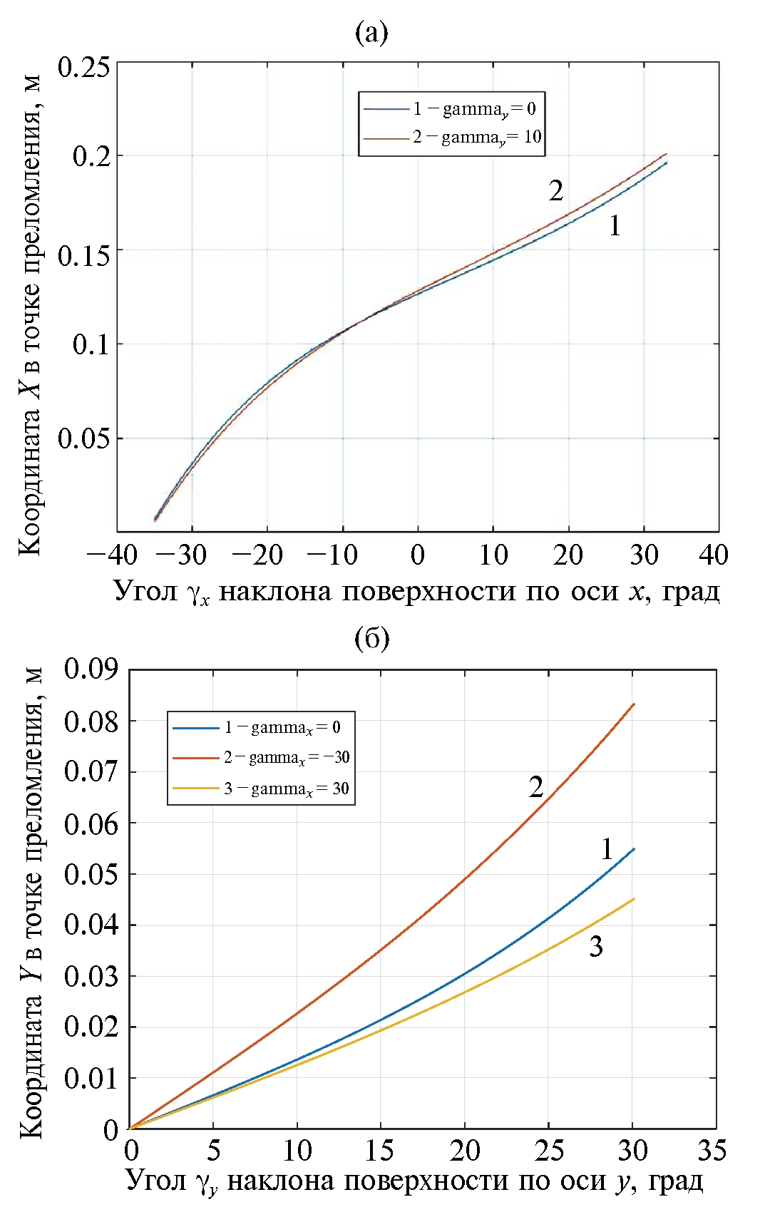 Решение представлено на рис. 5б для трёх различных фиксированных уклонов по оси x и изменения уклонов γy от 0 до 30°. Кривая 1 соответствует γx = 0 – отсутствию уклона по оси x. Кривая 2 соответствует уклону γx = –30°, а кривая 3 соответствует γx = +30°. Видно, что смещение точки А по оси y очень чувствительно к уклону по оси y и слабо зависит от уклона по оси x. Отметим, что уклоны в 30 градусов по обеим осям являются экстремально большими. В реальности уклоны редко превышают 10 градусов.