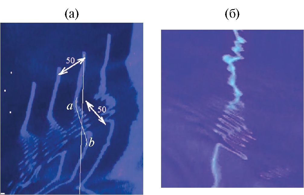 Рис. 9. Участки видеокадров с увеличением: а – ночные измерения, масштаб изображения по двум осям представлен отрезками по 50 мм, тонкая вертикальная линия – форма луча при невозмущённой поверхности, кривая ab – средняя форма луча при отсутствии капиллярной волны; б – капиллярные волны, зарегистрированные в дневное время.