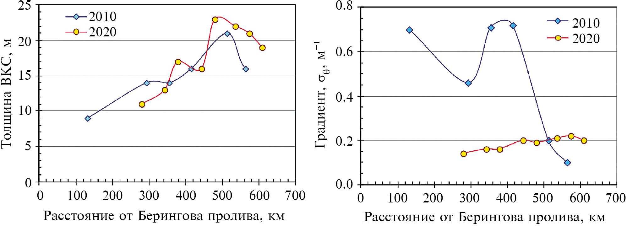 Рис. 8. Толщина верхнего квазиоднородного слоя (ВКС) и максимальный градиент условной плотности на его нижней границе на станциях, расположенных на стрежне потока беринговоморских вод в Чукотском море на разном расстоянии от Берингова пролива, по данным съёмок НИС “ТИНРО” летом 2010 г. и 2020 г.