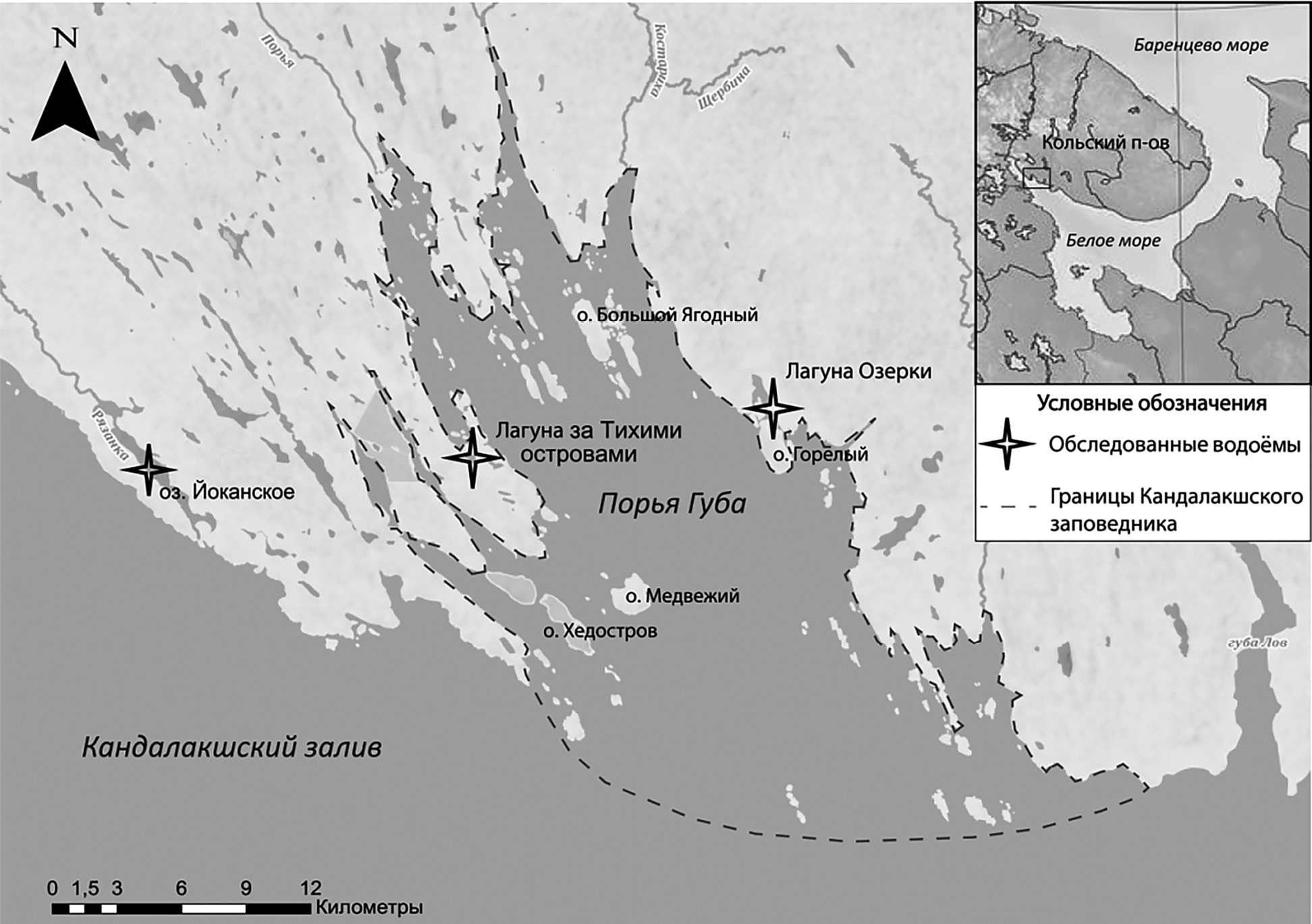 Несколько водоемов, находящихся на разных стадиях естественного отделения от Белого моря, обнаружены недалеко от Беломорской биологической станции имени Н.А. Перцова биологического факультета МГУ имени М.В. Ломоносова (Карельский берег, Кандалакшский залив Белого моря) [8, 23 24], и, начиная с 2012 г. [11], за ними ведутся мониторинговые комплексные наблюдения [1, 12, 14, 15, 20, 25, 26]. В 2019–2022 гг. аналогичными исследованиями были охвачены несколько полуизолированных водоемов на противоположном берегу Кандалакшского залива Белого моря в заливе Порья Губа [13], где основное внимание было уделено изучению лагуны с местным названием Озерки. Лагуна Озерки, так же как и остальная акватория Порьей губы относятся к Кандалакшскому государственному природному заповеднику, который дал разрешение на выполнение данного исследования. Интерес к этому водоему обусловлен тем, что работы по его изучению были начаты еще в 1930-х годах научной группой Беломорской методической станции Государственного гидрологического института [3] и их удалось повторить через 90 лет в 2019–2022 гг. [9, 10]. В сравнительных исследованиях было установлено, что из-за продолжающегося послеледникового подъема берега пороги, отделяющие Озерки от моря, обмелели, в результате чего усилилась изоляция лагуны от моря, что привело к возникновению вертикальной стратификации в её отдельных частях, особенно в наиболее удаленном от моря плесе. Кроме того, в 2021–2022 гг. были обследованы ещё два водоема: лагуна за Тихими островами и оз. Йоканское (Ёканское), особенности расположения которых позволяли предполагать наличие в них стратификации.