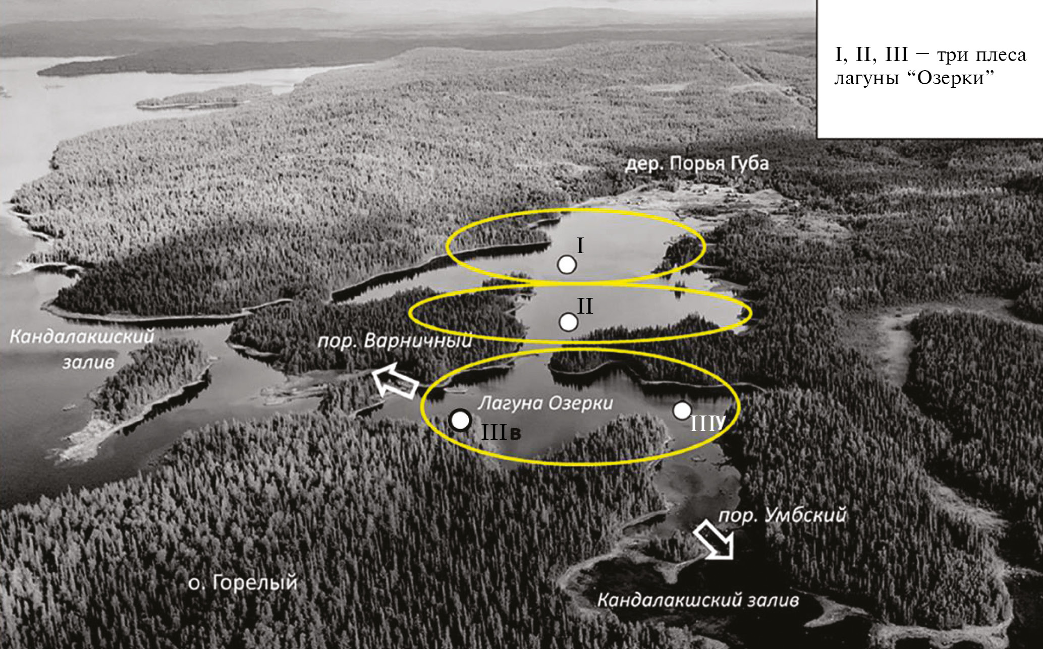 Лагуна Озерки расположена в восточной части Порьей губы. Она представляет собой остаток пролива между островом Горелый и материком, который в результате поднятия берега превратился в лагуну, соединенную с морем двумя порогами и состоящую из трех плесов, разделенных отмелями (рис. 2). На берегу дальнего от моря (кутового) плеса (I), расположено заброшенное поморское село Порья Губа, которое было ликвидировано в 1965 г. как “неперспективное”. С ним сообщается средний плес (II), отделенный узким мелководным проливом от ближнего к морю плеса (III), который сообщается с морем во время прилива. В кутовую часть I плеса впадают р. Порья и небольшой ручей.