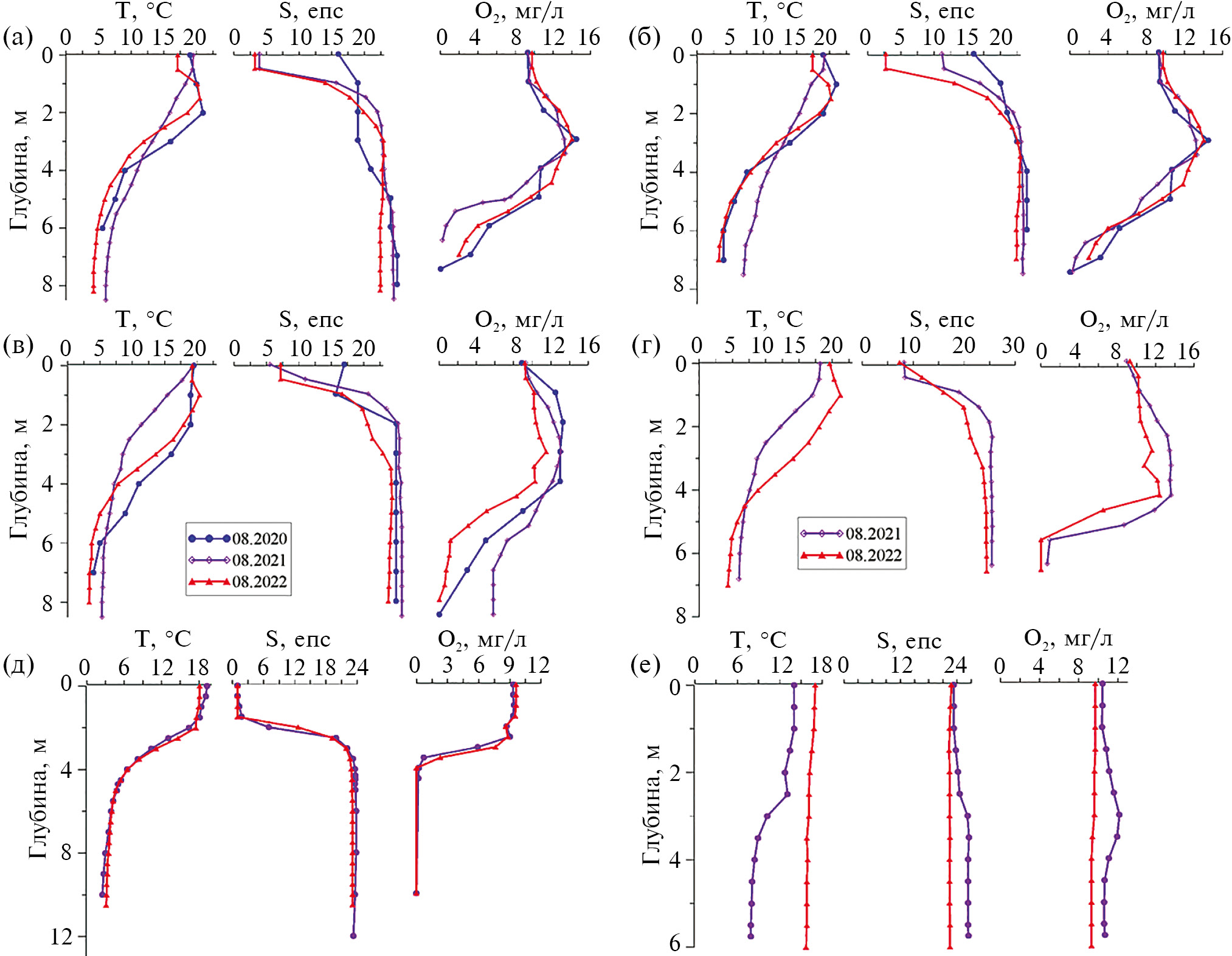 Рис. 3. Вертикальные профили некоторых гидрологических параметров: а) I плес; б) II плес; в) III плес (Умбский порог); г) III плес (Варничный порог); д) оз. Йоканское; е) Лагуна за Тихими островами.