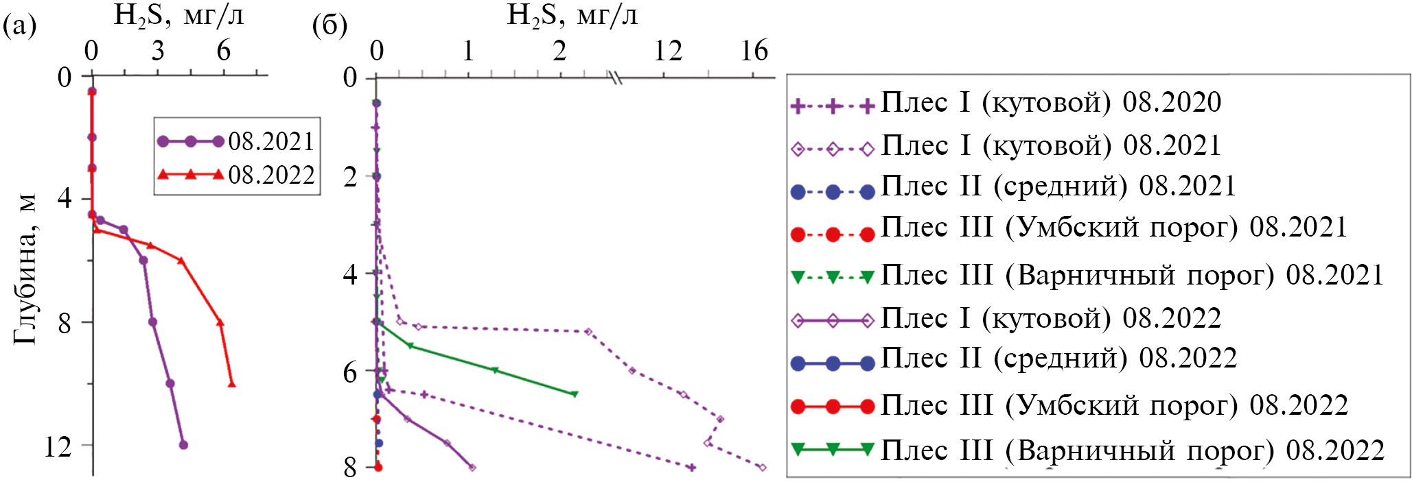 Выполненные исследования показали присутствие сероводорода в воде всех трех плесов лагуны Озерки (рис. 4, табл. 2). Но, если в гидродинамически более активных водах II плеса и умбского порога III плеса сероводород обнаруживался эпизодически в следовых количествах (не более 0.03 мг/л) и только в придонных горизонтах, то в водах станции около Варничного порога III плёса и, особенно, в дальней яме I плеса он появляется по мере усугубления стратификации, достигая максимальных значений в анаэробных придонных горизонтах. Наиболее высокие значения концентраций сероводорода (13.27 и 16.45 мг/л) отмечены в придонных горизонтах наиболее удаленного от прямого сообщения с морем I плеса. Основываясь на данных прошлых лет, мы предполагали, что стратификация вод в “дальней яме” носит устойчивый характер и возможно уже не нарушается в межсезонье, а если и нарушается, то затем быстро восстанавливается. Наблюдавшееся в 2022 году значительное уменьшение концентрации сероводорода указывает на возможность, по крайней мере, частичного освежения воды зимой за счет поступления воды из соседнего плеса и ее подмешивания к застойным придонным водам.