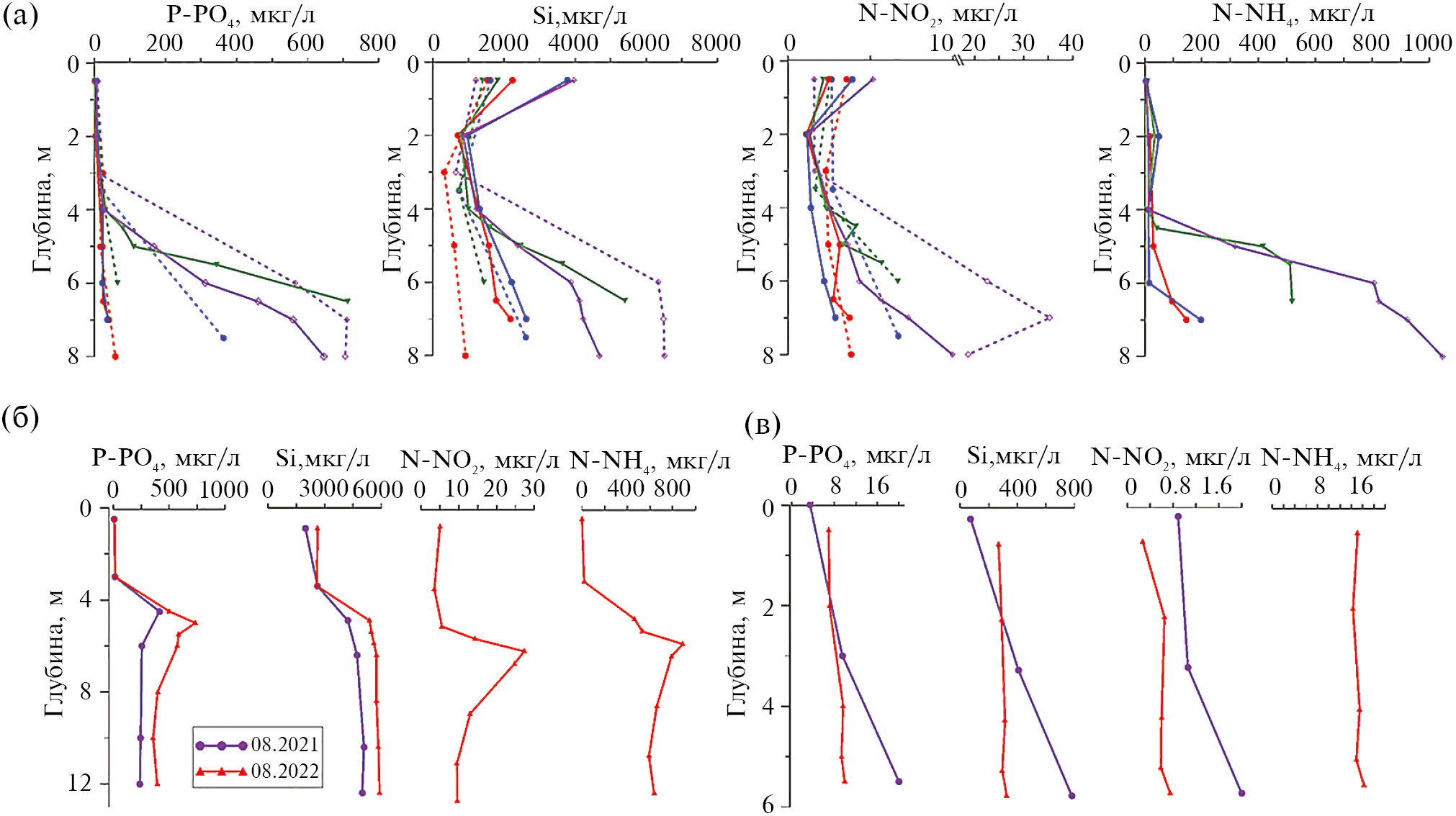 В 2021 и 2022 гг. во всех водоемах фиксировалось увеличение содержания минерального фосфора в придонных горизонтах, который при отсутствии потребителей (фитопланктона) в анаэробных водах начинает накапливаться. Можно отметить, что уже в II (среднем) плесе анаэробные процессы выражены более отчетливо, чем в III (первом от моря), и содержание всех определяемых биогенных элементов в придонных водах существенно превышает их количество в аэробной зоне. Наиболее сильно вертикальная стратификация вод с развитием всех сопутствующих стагнации явлений, выражена в I плесе, где в придонных анаэробных водах отмечен наиболее высокий уровень содержания не только сероводорода, фосфатов и кремния, но и нитритов. В кислородных водах нитриты окисляются до нитратов, тогда как в анаэробных условиях они восстанавливаются до аммония, способствуя накоплению последнего. Концентрация их в морской воде невелика и обычно составляет доли или единицы мкг/л. Ионы аммония появляются в воде и как первичный продукт обмена веществ, и на последней стадии полной минерализации органических остатков. Содержание аммонийного азота, определенное во время полевых работ в августе 2022 года было минимально в поверхностных водах и во всех случаях возрастало в придонных горизонтах, достигая максимальных значений – 1050 и 636 мкг/л в дальней яме I плеса лагуны Озерки и в оз. Йоканском соответственно.