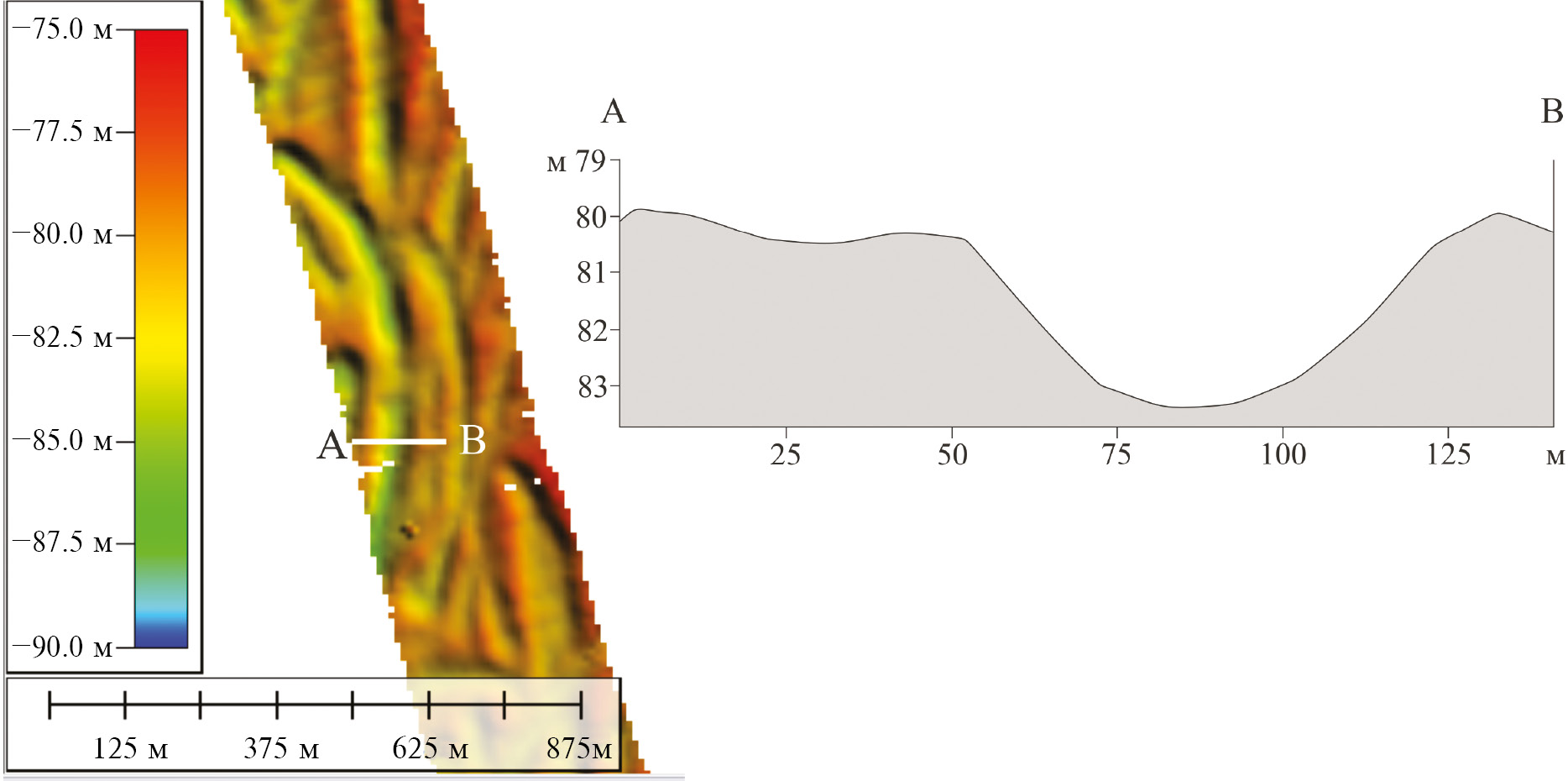 Результаты съемки сохраняются программным комплексом в формате .log, после чего происходит их обработка. На этапе перед началом съемки оператором настраиваются программные фильтры по глубине и качеству сигнала (в зависимости от ожидаемых на участке глубин), иногда выполняется настройка дополнительных фильтров, таких как угловой, фильтр с применением метода скользящего среднего и других. Задаются параметры скорости звука в водной среде, измеренные на станциях в ходе рейса. Затем, после сохранения данных на носителе, происходит ручная постобработка материалов оператором. Отсев и удаление лучей, данные которых выглядят ошибочными или неточными, происходит экспертным методом. В отдельных случаях, при некорректной работе некоторых приборов (нарушенной стабилизации гирокомпаса при штормовой погоде и т. п.) или других программных ошибках в данных, на стадии конвертации ЦМР из первичного формата в формат .asc, применяются программные настройки для исправления искривлений, невязок и т. п. Для построения результирующей ЦМР, пригодной для обработки и дешифрирования борозд, из исходного файла задаются настройки разрешения (ЦМР в данном случае строились с размером пикселя 10 × 10 м), способа осреднения данных и настройки отображения. Таким образом, результирующая ЦМР (рис. 2) имеет разрешение 10 м в плане и от 0.1 до 1.0 м по глубине, что сильно зависит от погодных условий.
