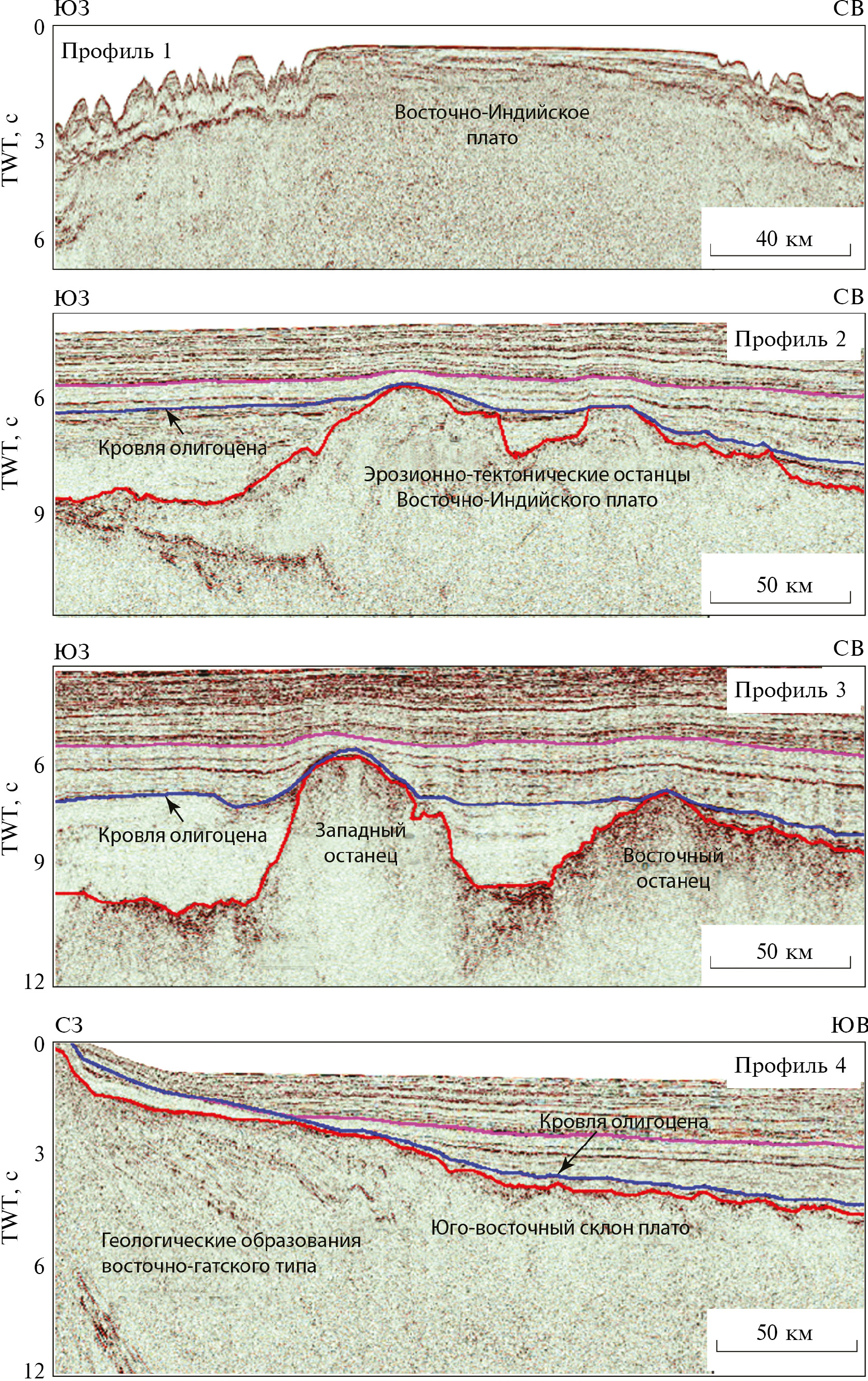 Рис. 6. Фрагменты разрезов профилей ОГТ, характеризующие строение Восточно-Индийского плато, (по [43] с доп.). Положение профилей см. рис. 3, 5.