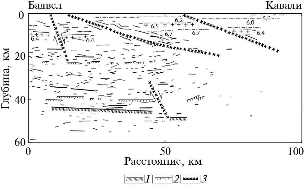 Рис. 7. Глубинный сейсмический разрез по профилю Бадвел-Кавали, характеризующий строение Куддапахского блока на границе с Бенгальским заливом, по [7, 28]. На разрезе видно, что граница Мохо с разрывами в виде ступеней погружается в сторону Бенгальского залива. 1 – граница Мохо; 2 – сильные отражающие границы в низах коры; 3 – пологонаклоненные отражающие границы. Положение профиля см. рис. 5.
