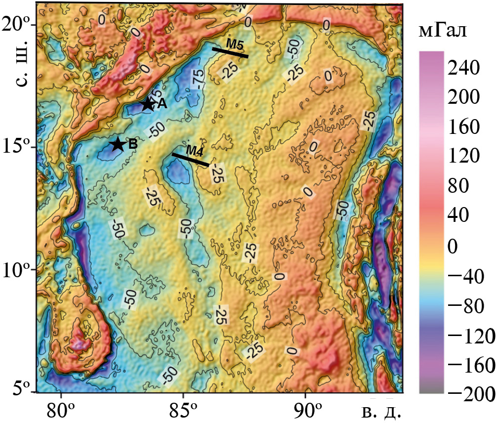 Рис. 8. Карта гравиметрического поля Бенгальского залива в редукции Фая (по [46] с доп.). В западной части залива выделяются два типа отрицательных аномалий: протяженные узкие и изометрично овальные. Пояснения в тексте. Звездочками отмечены скважина А и скважина B [33], которые вскрыли верхний гранитогнейсовый слой континентальной коры. М4 и М5 – профили ГСЗ.