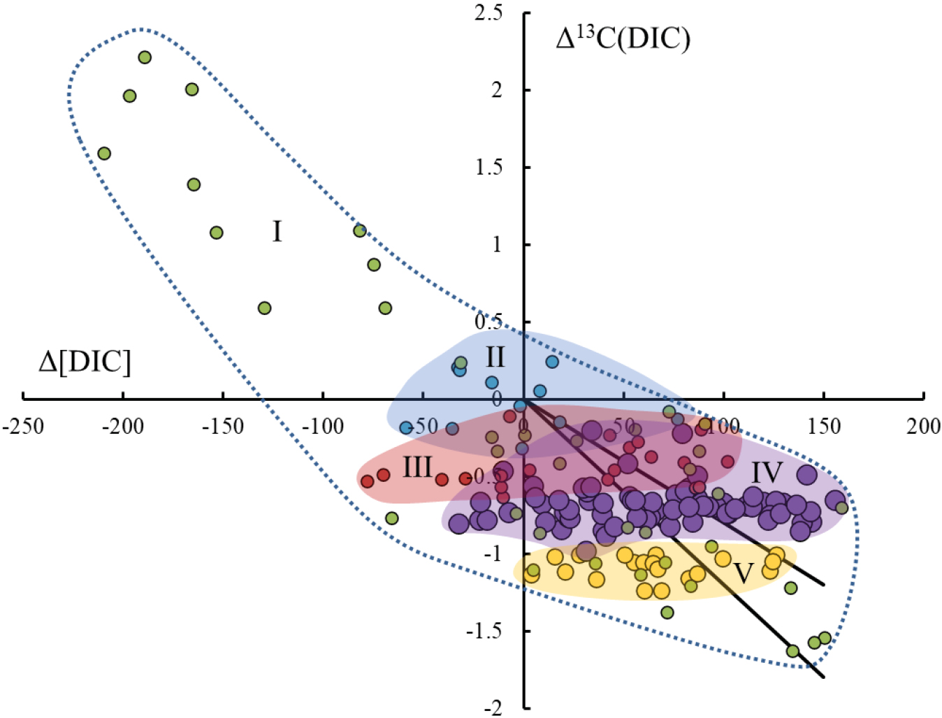 Наличие корреляции величин Δ13С(DIC)АТМ и [DIC] (рис. 7б) позволяет определить усредненную величину [DIC]АТМ – т.е. концентрацию DIC, характерную для равновесия с атмосферой конкретных субповерхностных вод изученного района во время наблюдений. Величина [DIC]АТМ, соответствующая пересечению тренда с линией ординат, составляет 2106 μмоль/кг. Относительно этой величины почти все дихотермальные и субповерхностные воды показывают преобладание процесса окисления ОВ над ПП ([DIC] > 2106 μмоль/кг), за исключением субповерхностных вод ПОЛ, в которых наблюдается дефицит DIC, вызванный активным потреблением при первичной продукции.