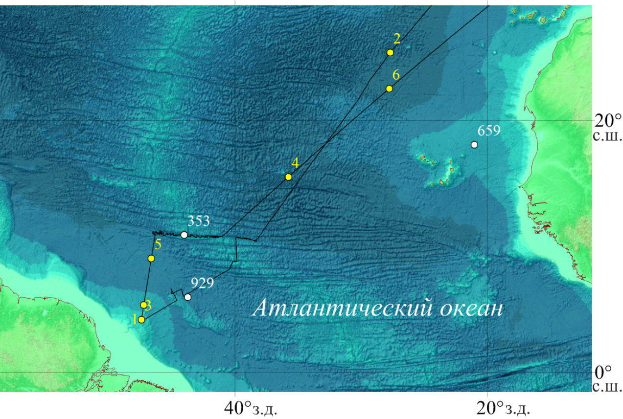 Непрерывное сейсмоакустическое профилирование в 60-м рейсе НИС “Академик Иоффе” велось по всему маршруту экспедиции от границы экономической зоны Испании через Канарскую котловину, зону трансформного разлома Вима, Гвианскую котловину до границы экономической зоны Бразилии (рис. 1). Работы проводились на скорости 12–13 узлов практически непрерывно в течение 31 дня. Общая длина выполненных промерных галсов составила 6650 морских миль. Основные параметры настройки профилографа SES-2000, использовавшиеся в ходе работ: рабочая частота 4–6 кГц, скорость излучения – до шести импульсов в секунду [2].