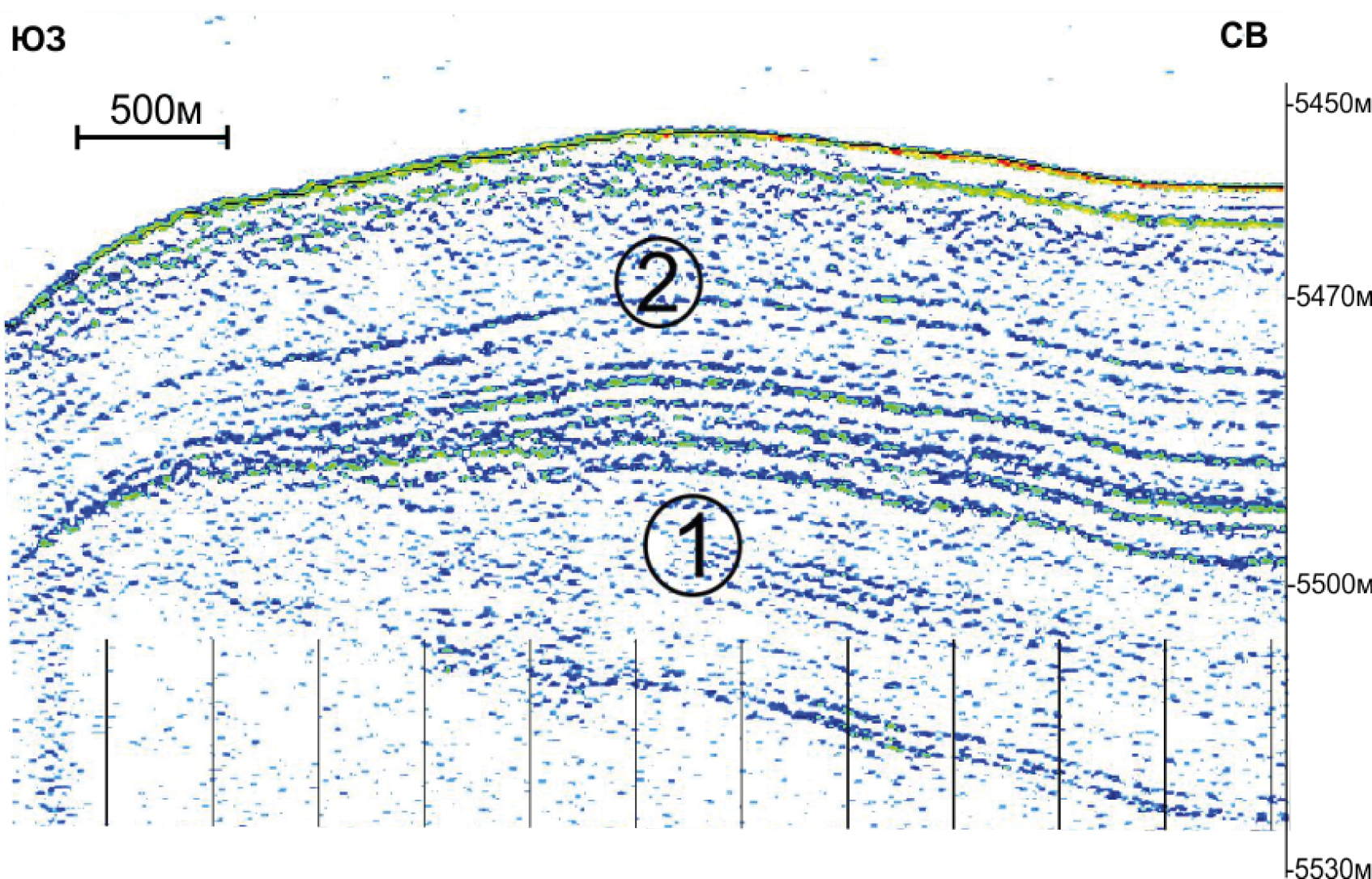 Рис. 2. Отложения холмообразного контуритового дрифта. 1 и 2 – разные генерации контуритов, залегающие с угловым несогласием. Участок 2 (положение фрагмента показано на рис. 1).