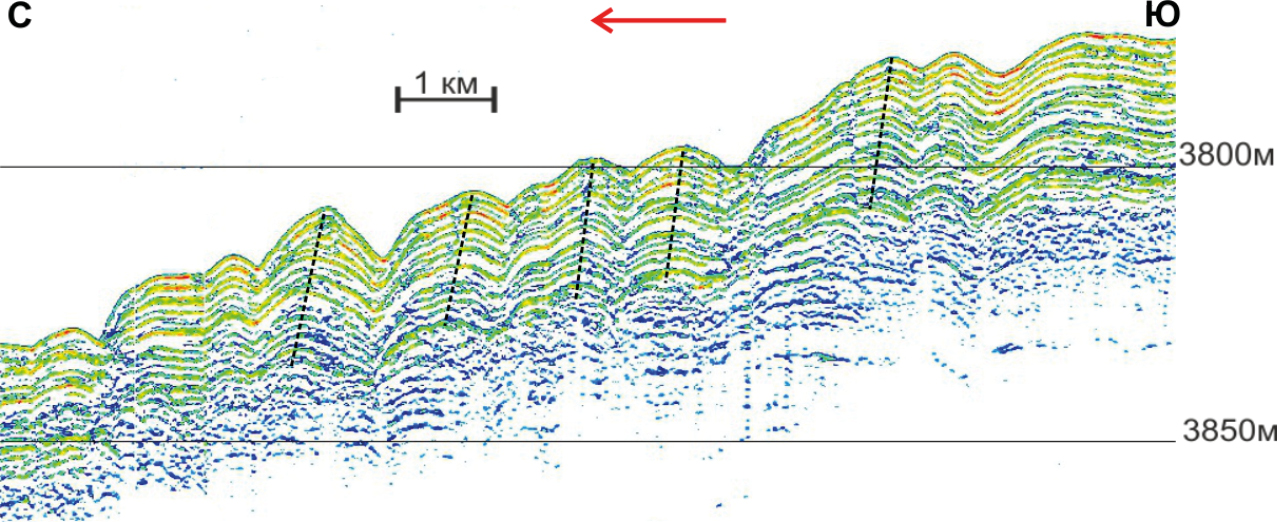 Рис. 4. Осадочные волны во внешней зоне конуса выноса Амазонки. Красной стрелкой указано направление сноса материала плотностными потоками, черные пунктирные линии соединяют вершины волн; их наклон иллюстрирует смещение вершин вверх по течению потока (обратная миграция). Фрагмент 3 на рис. 1.