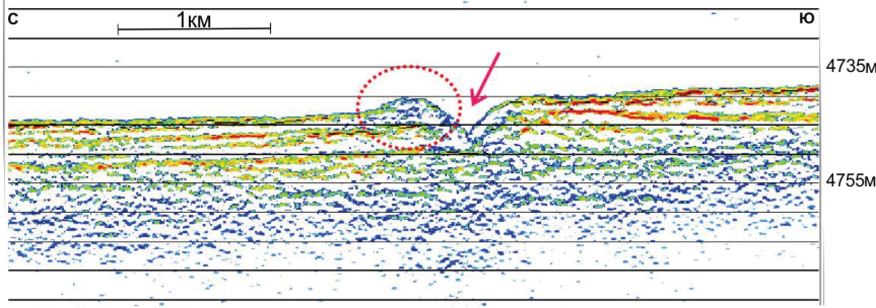Сейсмофация гравититов. Отложения гравитационного генезиса (гравититы) на сейсмических разрезах характеризуются преимущественно хаотическим типом волновой картины, эрозионным характером подошвы, линзовидной, ограниченной в пространстве формой и неровной, часто выпуклой вверх кровлей. Одно из оползневых тел, представленных такой записью, пересечено на конусе выноса Амазонки (рис. 3а). С неровностями рельефа, сопровождающими оползневые тела, часто связаны значительные искажения формы реальных границ на сейсмоакустических разрезах и возникновение дифрагированных волн.