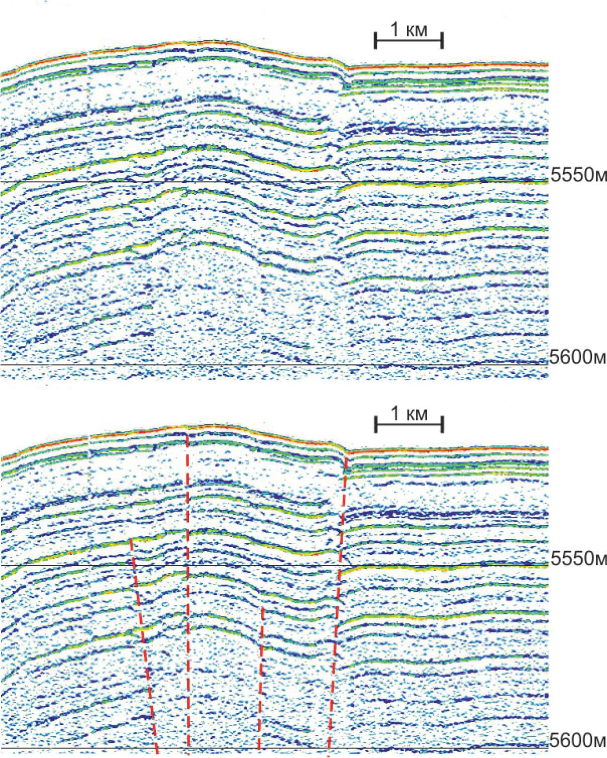 Рис. 6. Малоамплитудные разрывные нарушения в верхней части разреза (красный пунктир), приуроченные к поднятию в рельефе дна. Вверху – без интерпретации, внизу – с интерпретацией. Фрагмент 6 на рис. 1.