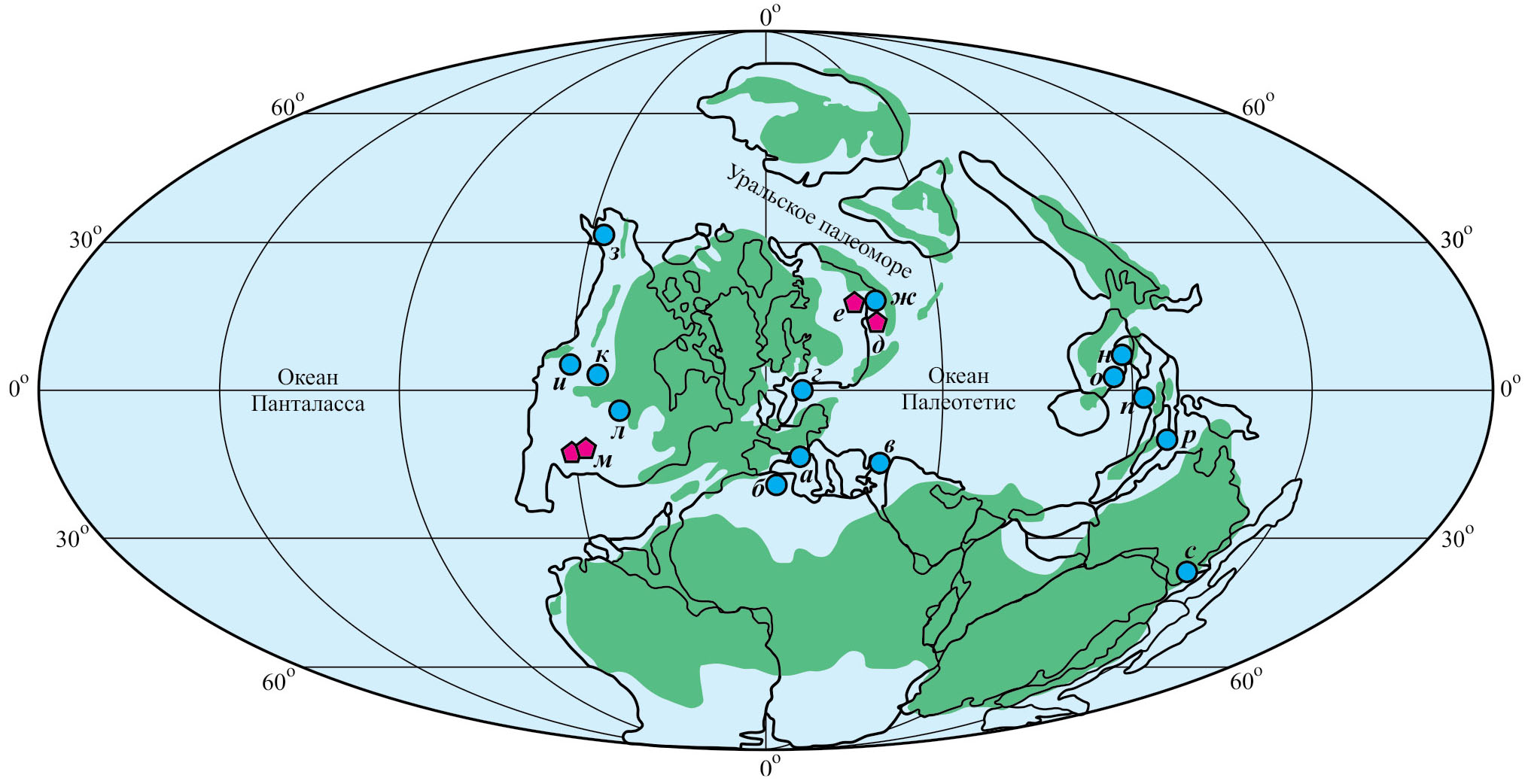 Рис. 2. Распространение радиолярий в турнейских отложениях нижнего карбона: а – Южная Франция, Кабьер, Эро, Верхние Пиренеи (Deflandre, 1952, 1953; Holdsworth, 1973, 1977; Gourmelon, 1985, 1986, 1987); б – Северная Африка, Алжир, Сахара (Gourmelon, 1988); в – Турция, Стамбул (Holdsworth, 1973, 1977; Noble et al., 2008); г – Германия, Рейнские сланцевые горы (Braun, 1989, 1990; Won, 1983, 1991a, b, 1992, 1998; Won, Seo, 2010); д – Казахстан, Прикаспийская впадина, массив Карачаганак (Афанасьева, 1987, 2000); е, ж – Россия: (е) Волго-Уральский бассейн, скважина Мелекесская-1 (Афанасьева, 2022a, 2022б, 2023б; Afanasieva et al., 2023; Фортунатова и др., 2023), (ж) Оренбургское Приуралье (Афанасьева, Кононова, 2009; Afanasieva, Kononova, 2009); з–м – США: (з, и) Аляска и Невада (Holdsworth, Jones, 1980), (к) Юта (Park, Won, 2012), (л) Северная Дакота (Nazarov, Ormiston, 1987), (м) Оклахома (Ormiston, Lane, 1976; Cheng, 1986; Schwartzapfel, Holdsworth, 1996); н, о – Китай: (н) Гуанси (Wang, Kuang, 1993; Zhang et al., 2008; Wang et al., 2012), (о) Юньнань (Feng, Ye, 1996); п – Юго-Восточный Таиланд, район Саба Йой (Sashida et al., 2000); р – Малайзия, Северный Перак (Jasin, Harun, 2006); с – Восточная Австралия, хр. Нью-Ингленд (Aitchison, 1993). Местонахождения радиолярий турнейского яруса (а–г, ж–л, н–с) и нижнетурнейского подъяруса (д, е, м) нанесены на адаптированную схему глобальной реконструкции континентов и океанов для раннего карбона (Scotese, 2001).