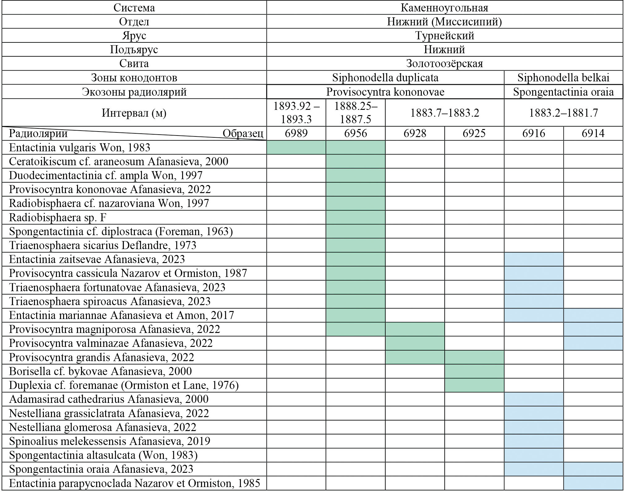 В настоящее время достоверные и очень хорошо сохранившиеся радиолярии раннетурнейского возраста установлены в Волго-Уральском бассейне в шести образцах скважины Мелекесская-1 (рис. 1, III; 5) в приграничных с девоном отложениях золотоозерской свиты (Афанасьева, Кононова, 2021; Афанасьева, 2022а, 2022б, 2023б; Afanasieva et al., 2023; Фортунатова и др., 2023). Изменение таксономического состава комплексов и прекрасная сохранность радиолярий позволяют установить в нижнетурнейских отложениях скв. Мелекесская-1 две сменяющие друг друга снизу вверх экозоны (рис. 3): Provisocyntra kononovae и Spongentactinia oraia, которые рассматриваются в объеме двух конодонтовых зон: Siphonodella duplicata и Siphonodella belkai.