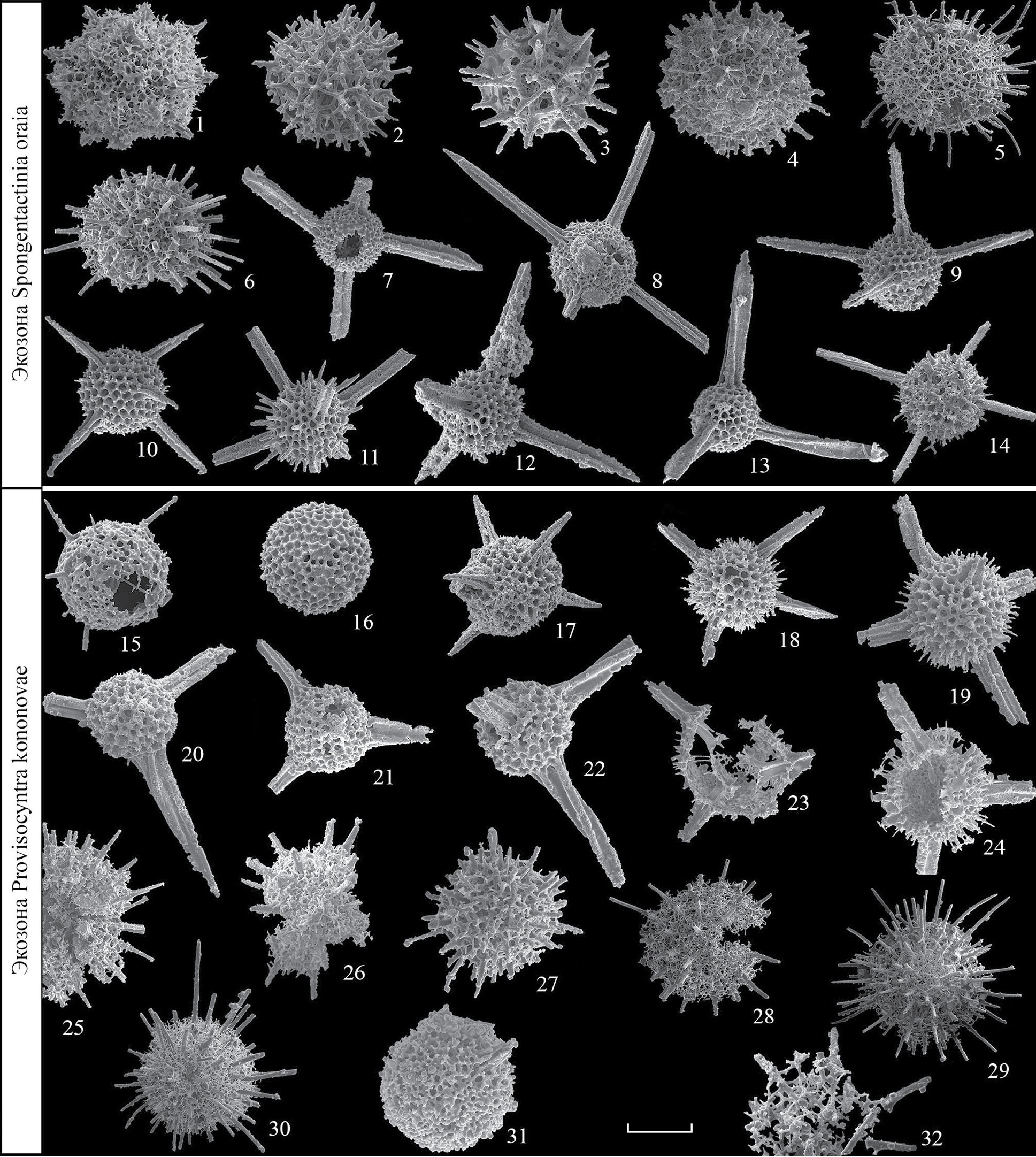 Рис. 6. Раннетурнейские радиолярии, Волго-Уральский регион, скв. Мелекесская-1, экозона Spongentactinia oraia (фиг. 1–14) и экозона Provisocyntra kononovae (фиг. 15–32) (по М.С. Афанасьевой из: Afanasieva et al., 2023, рис. 8, и Фортунатова и др., 2023, табл. 4 и 5, с изменениями и дополнением): 1 – Adamasirad cathedrarius Afanasieva, 2000 (штрих = 65 мкм); 2 – Nestelliana glomerosa Afanasieva, 2022 (68 мкм); 3 – N. grassiclatrata Afanasieva, 2022 (65 мкм); 4 – Provisocyntra cassicula Nazarov et Ormiston, 1987 (100 мкм); 5 – P. magniporosa Afanasieva, 2022 (85 мкм); 6 – P. valminazae Afanasieva, 2022 (135 мкм); 7 – Spongentactinia altasulcata (Won, 1983) (75 мкм); 8 – S. oraia Afanasieva, 2023 (128 мкм); 9 – Entactinia zaitsevae Afanasieva, 2023 (84 мкм); 10 – E. mariannae Afanasieva et Amon, 2017 (81 мкм); 11 – E. parapycnoclada Nazarov et Ormiston, 1985 (112 мкм); 12 – Triaenosphaera fortunatovae Afanasieva, 2023 (68 мкм); 13 – T. spiroacus Afanasieva, 2023 (76 мкм); 14 – Spinoalius melekessensis Afanasieva, 2019 (128 мкм); 15 – Borisella cf. bykovae Afanasieva, 2000 (85 мкм); 16 – Duplexia cf. foremanae (Ormiston et Lane, 1976) (78 мкм); 17 – Entactinia vulgaris Won, 1983 (112 мкм); 18 – E. mariannae Afanasieva et Amon, 2017 (73 мкм); 19 – E. zaitsevae Afanasieva, 2023 (73 мкм); 20 – Triaenosphaera fortunatovae Afanasieva, 2023 (76 мкм); 21 – T. sicarius Deflandre, 1973 (73 мкм); 22 – T. spiroacus Afanasieva, 2023 (66 мкм); 23 – Radiobisphaera cf. nazaroviana Won, 1997 (81 мкм); 24 – R. sp. F (73 мкм); 25 – Duodecimentactinia cf. ampla Won, 1997 (87 мкм); 26 – Provisocyntra magniporosa Afanasieva, 2022 (150 мкм); 27 – P. cassicula Nazarov et Ormiston, 1987 (148 мкм); 28 – P. valminazae Afanasieva, 2022 (124 мкм); 29 – P. grandis Afanasieva, 2022 (235 мкм); 30 – P. kononovae Afanasieva, 2022 (64 мкм); 31 – Spongentactinia cf. diplostraca (Foreman, 1963) (53 мкм); 32 – Ceratoikiscum cf. araneosum Afanasieva, 2000 (53 мкм). Белой линией отмечена граница между экозонами радиолярий.