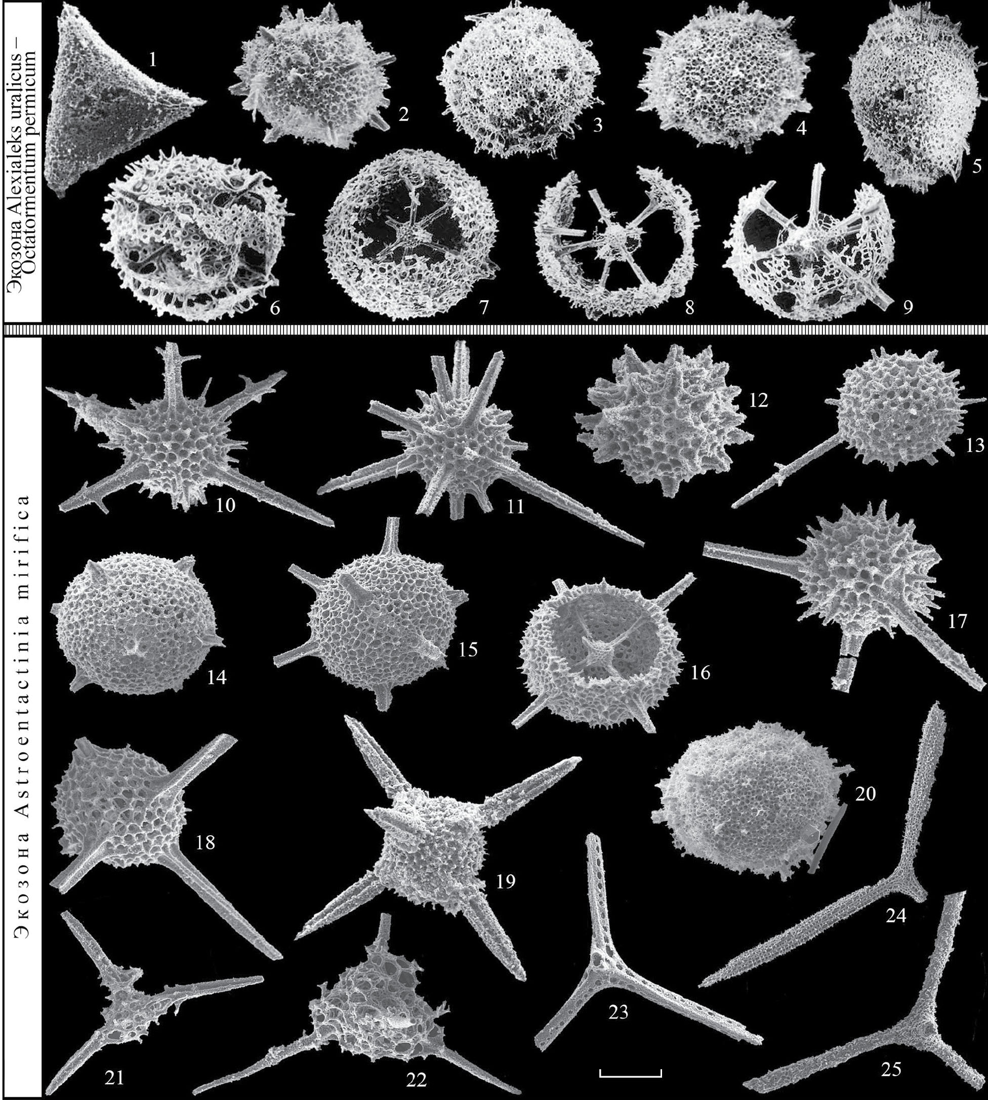Рис. 9. Кунгурские радиолярии Южного Урала из разреза Алегазово, экозона Alexialeks uralicus–Octatormentum permicum (фиг. 1–9) и разреза Мечетлино, экозона Astroentactinia mirifica (фиг. 10–25): 1 – Ruzhencevispongus uralicus Kozur, 1980 (штрих = 58 мкм); 2 – Copicyntra ruzhencevi ruzhencevi Kozur et Mostler, 1989 (50 мкм); 3 – C. fragilispinosa Kozur et Mostler, 1989 (50 мкм); 4 – C. ruzhencevi gracilispinosa Kozur et Mostler, 1989 (50 мкм); 5 – Copiellintra oviformis (Kozur et Mostler, 1989) (50 мкм); 6 – Octatormentum permicum (Kozur et Mostler, 1989) (50 мкм); 7 – Alexialeks distinctus Afanasieva, 2023 (58 мкм); 8 – A. alius Afanasieva, 2023 (75 мкм); 9 – A. uralicus (Kozur et Mostler, 1989) (50 мкм); 10 – Apophysiacus sakmaraensis (Kozur et Mostler, 1989) (90 мкм); 11 – Astroentactinia mirifica Afanasieva, 2023 (100 мкм); 12 – A. inscita Nazarov in Isakova et Nazarov, 1986 (78 мкм); 13 – Borisella sP. K (77 мкм); 14 – Helioentactinia parvispina Afanasieva, 2023 (100 мкм); 15 – H. venusta Afanasieva, 2023 (122 мкм); 16 – Alexialeks distinctus Afanasieva, 2023 (99 мкм); 17 – Entactinia mariannae Afanasieva et Amon, 2017 (78 мкм); 18 – E. meyeni (Kozur et Mostler, 1989) (109 мкм); 19 – Pluristratoentactinia sp. L (77 мкм); 20 – Copicyntra ruzhencevi gracilispinosa Kozur et Mostler, 1989 (78 мкм); 21 – Tetragregnon sp. A (122 мкм); 22 – T. vimineum Amon, Braun et Chuvashov, 1990 (120 мкм); 23 – Quadriremis nevadensis Nazarov et Ormiston, 1989 (133 мкм); 24 – Latentibifistula triacanthophora Nazarov et Ormiston, 1983 (263 мкм); 25 – Ormistonella gliptoacus (Nazarov et Ormiston, 1985) (149 мкм). Обозначение: вертикальной штриховкой отмечено отсутствие радиолярий.