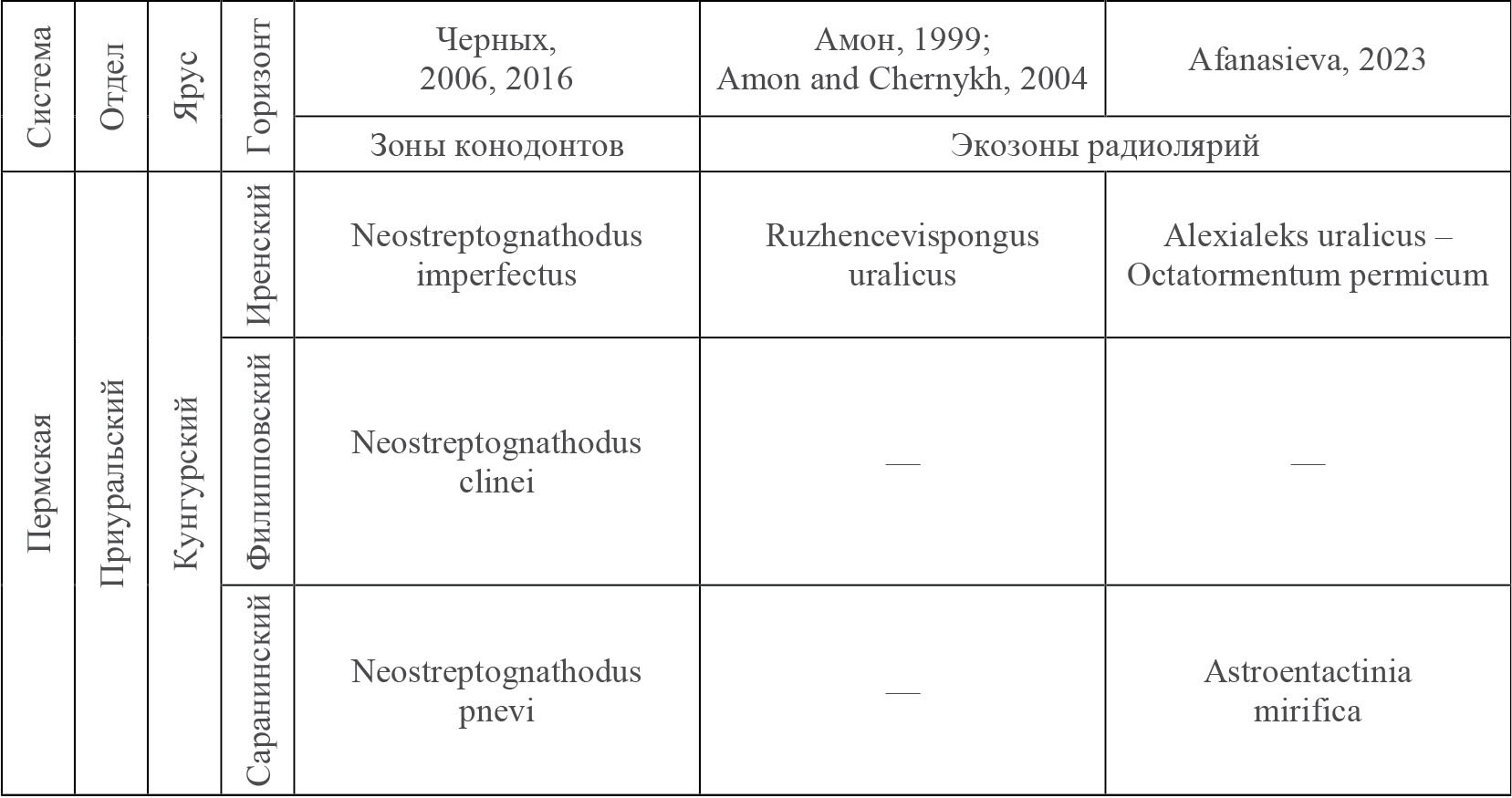 Изменение таксономического состава ассоциаций радиолярий в отложениях разрезов Алегазово и Мечетлино позволило установить две экозоны (рис. 10, 12): Astroentactinia mirifica для саранинского горизонта и Alexialeks uralicus – Octatormentum permicum для иренского горизонта (Afanasieva, 2023).