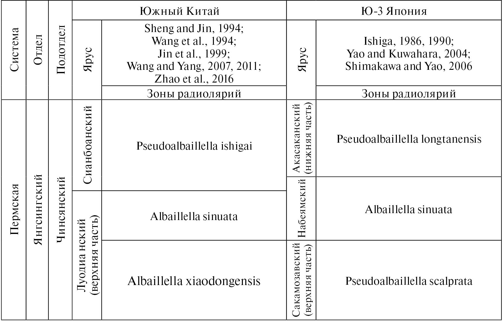 В Юго-Западной Японии в этом интервале также установлены три зоны радиолярий (снизу вверх) (рис. 11): Pseudoalbaillella scalprata, Albaillella sinuata и Pseudoalbaillella longtanensis (Ishiga, 1986, 1990; Yao, Kuwahara, 2004; Shimakawa, Yao, 2006).