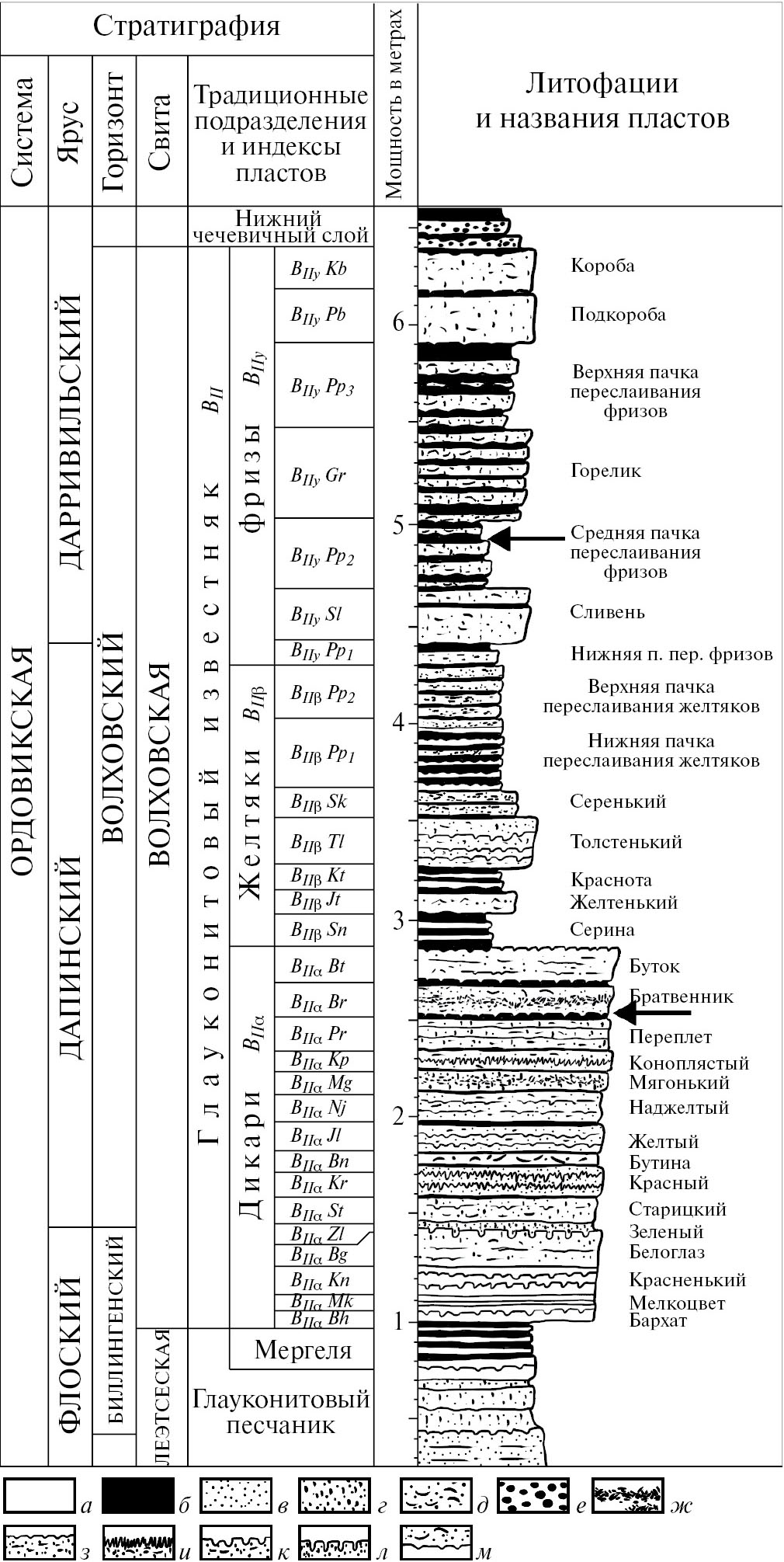 Рис. 2. Стратиграфическая схема нижнего и среднего ордовика Ленинградской обл. (по: Дронов, 1998; Dronov et al., 2003, с изменениями). Уровни находок отмечены стрелками. Обозначения: а – пелитоморфный известняк, в т.ч. сильно глинистый; б – глина; в – кварцевые пески и песчаники; г – глауконитовые пески; д – биокластический известняк; е – известняки и глины с железистыми оолитами; ж – интенсивно биотурбированные породы с заполнением ходов контрастным к окружающей породе материалом; з – поверхности твердого дна со сверлениями Trypanites; и – поверхности твердого дна со сверлениями типа “карандашей”; к – иррегулярные поверхности твердого дна с железистой импрегнацией; л – поверхность с амфорообразными норками (“стекло”); м – бугорки Bergaueria на нижней поверхности пластов.