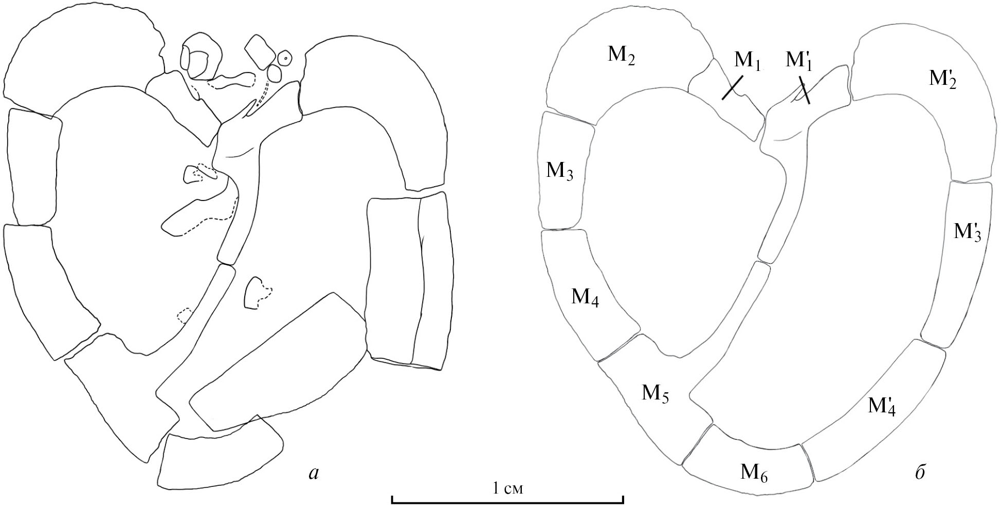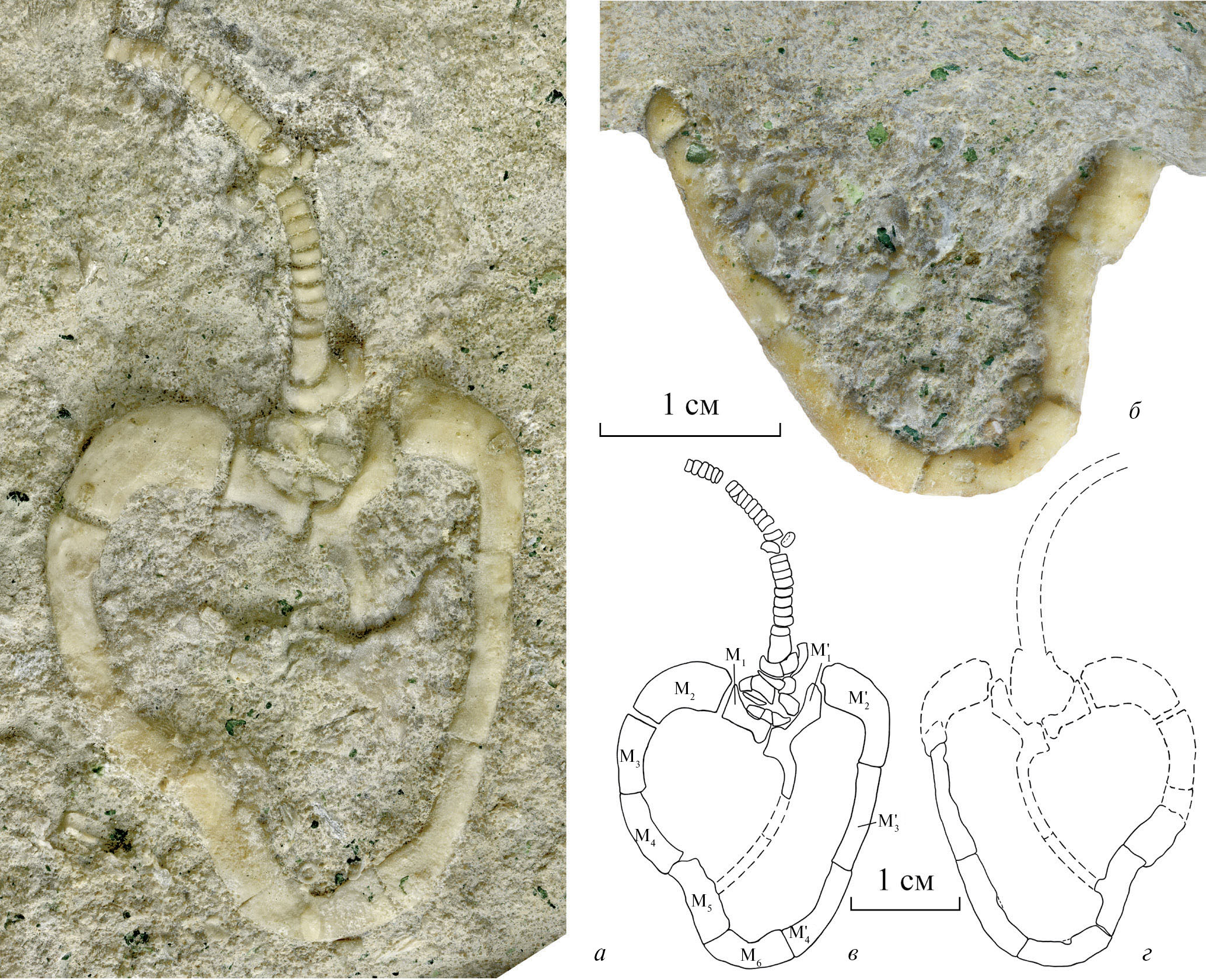Описание (рис. 3). У единственного образца сохранилась тека со слегка вдавленной внутрь маргинальной табличкой М5 и обломанным отходящим от него зигальным отростком. Тека хорошо очищена от породы с вентральной стороны и в задней половине – с дорсальной стороны. Аулакофор также слегка вдавлен внутрь теки вместе с правой и левой первыми маргиналями М1 и М′1 . Несмотря на эту деформацию, тека реконструируется как имеющая вытянуто-сердцевидное симметричное очертание. Ее длина (31 мм) превышает ширину (26 мм) в 1.2 раза. Строение маргинального обрамления теки типичное для рода: шесть правых и четыре левых маргинали. Первая левая маргиналь чуть длиннее правой, и от ее правой части отходит относительно узкий зигальный отросток (ширина около 1 мм). Он обломан на конце, и его сохранившаяся длина 7 мм. Таким образом, шов между первыми маргиналями слегка смещен вправо от оси симметрии теки. Правая и левая вторые маргинали близки по размерам и изогнутой форме, но левая (7 мм длиной по прямой) чуть длиннее правой (6 мм длиной). Обе вторые маргинали являются наиболее массивными и широкими (их ширина до 6 мм). Правые третья, четвертая и пятая маргинали почти одинаковой длины и ширины (длина каждой 8–9 мм и ширина 3–4 мм). От пятой правой маргинали отходил зигальный отросток внутрь теки, но от него сохранилось лишь короткое основание. Шестая правая маргиналь симметрично изогнута, этот изгиб слегка смещен относительно оси теки вправо. Поэтому, несмотря на свое замыкающее положение в заднем обрамлении теки, она отнесена к правым маргиналям. Третья левая маргиналь самая длинная из всех (11 мм) при ширине 2.5 мм. Она почти прямая. Четвертая левая маргиналь длиной 9 мм. Ее дистальный конец слегка изогнут, что хорошо видно с левой стороны, и тем слегка нарушает симметрию изгиба задней части теки. Вентральная поверхность маргиналей гладкая, без скульптуры и четких выростов.