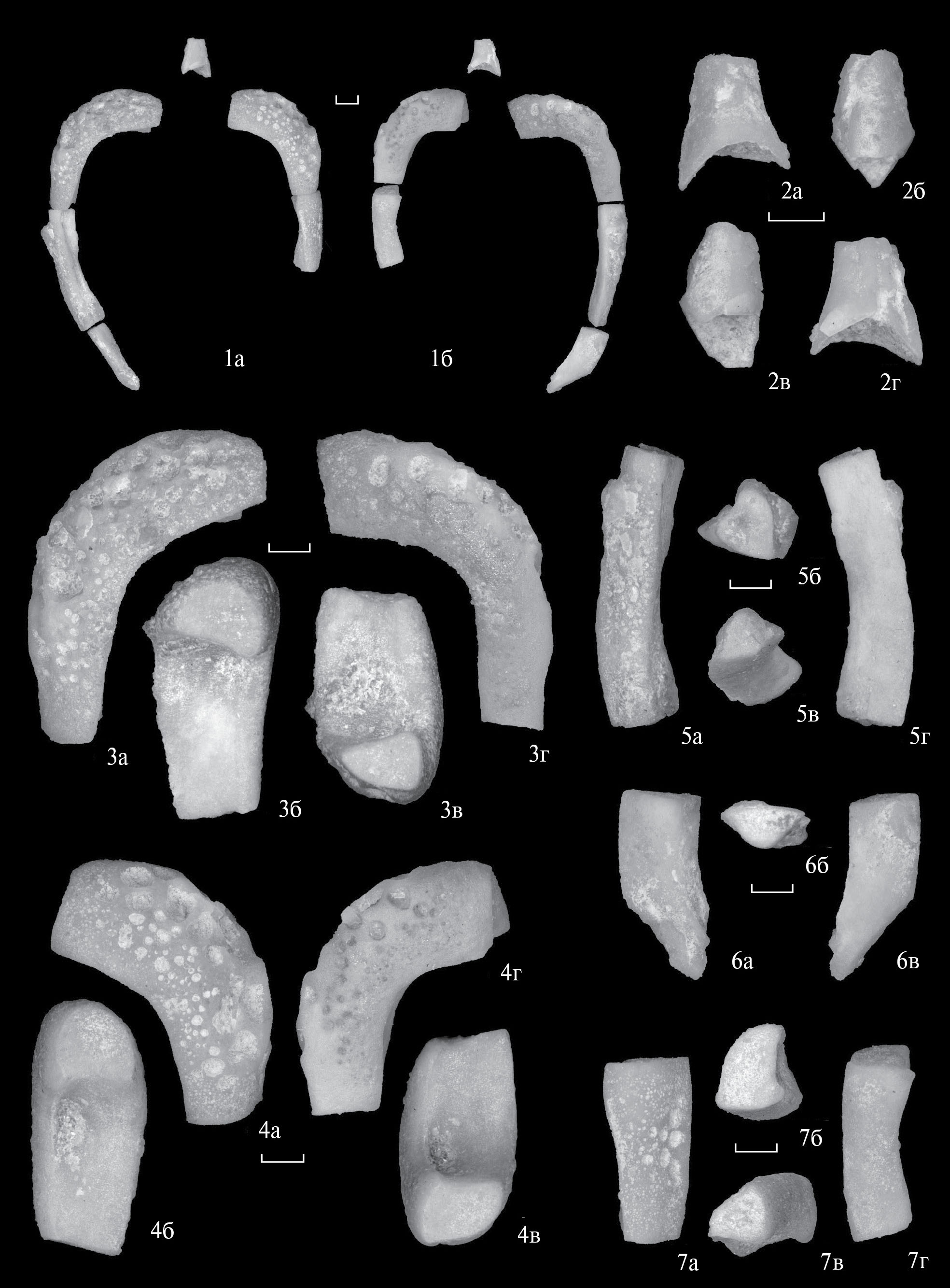 Фиг. 1–7. Phyllocystis cellularis sp. nov., отдельные маргинальные таблички: 1 – М2, экз. ПИН, № 4125/997: 1а – вид с дорсальной стороны, 1б – со стороны проксимальной фасетки, 1в – со стороны дистальной фасетки, 1г – с вентральной стороны; 2 – М2, экз. ПИН, № 4125/1023: 2а – вид с дорсальной стороны, 2б – со стороны проксимальной фасетки, 2в – со стороны дистальной фасетки, 2г – с вентральной стороны; 3 – М′2 , экз. ПИН, № 4125/1030: 3а – вид с дорсальной стороны, 3б – со стороны проксимальной фасетки, 3в – со стороны дистальной фасетки, 3г – с вентральной стороны; 4 – М′2 , экз. ПИН, № 4125/1031: 4а – вид с дорсальной стороны, 4б – со стороны проксимальной фасетки, 4в – со стороны дистальной фасетки, 4г – с вентральной стороны; 5 – табличка неопределенного положения, экз. ПИН, № 4125/989: 5а – вид с дорсальной стороны, 5б, 5в – вид со стороны фасеток, 5г – вид с вентральной стороны (дорсальная и вентральная стороны здесь и далее определяются по наличию скульптуры на первой и/или большей уплощенности второй, однако из-за неопределенности положения таблички относительно остального скелета ориентировка фасеток не указывается); 6 – табличка неопределенного положения, экз. ПИН, № 4125/1032: 6а – вид с дорсальной стороны, 6б, 6в – вид со стороны фасеток, 6г – вид с вентральной стороны; 7 – табличка неопределенного положения, экз. ПИН, № 4125/993: 7а – вид с дорсальной стороны, 7б, 7в – вид со стороны фасеток, 7г – вид с вентральной стороны; Ленинградская обл., Путиловский карьер; средний ордовик, дарривильский ярус, верхняя часть волховского горизонта (фризы). Длина масштабной линейки 1 мм.