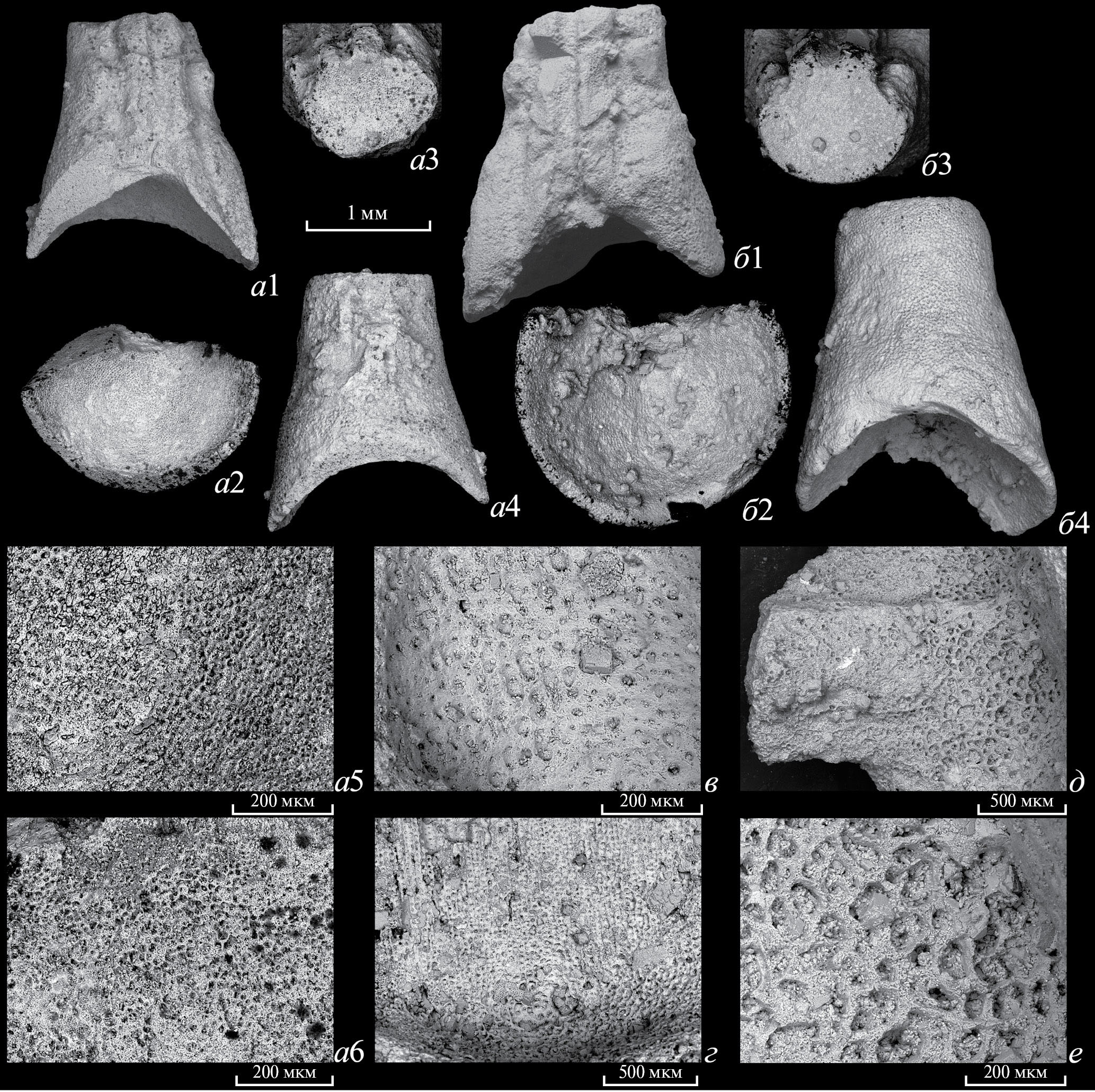 Рис. 6. Phyllocystis cellularis sp. nov., фотографии стилоконов и микроструктура: а – экз. ПИН, № 4125/1025d: а1 – вид с дорсальной стороны, а2 – вид с проксимальной стороны, а3 – вид с дистальной стороны, а4 – вид с вентральной стороны, а5 – микроструктура проксимальной стороны, а6 – микроструктура дистальной стороны; б – экз. ПИН, № 4125/1047: б1 – вид с дорсальной стороны, б2 – вид с проксимальной стороны, б3 – вид с дистальной стороны, б4 – вид с вентральной стороны; в, г – экз. ПИН, № 4125/995, микроструктура ячейки на внешней поверхности таблички M′3 (в) и микроструктура внутренней поверхности той же таблички M′3 (г); д, е – экз. ПИН, № 4125/988, микроструктура внутренней поверхности таблички М5, в месте отхождения зигального отростка; Ленинградская обл., Путиловский карьер (а) и левый берег р. Лынна близ устья (б–е); средний ордовик, дарривильский ярус, верхняя часть волховского горизонта (фризы).