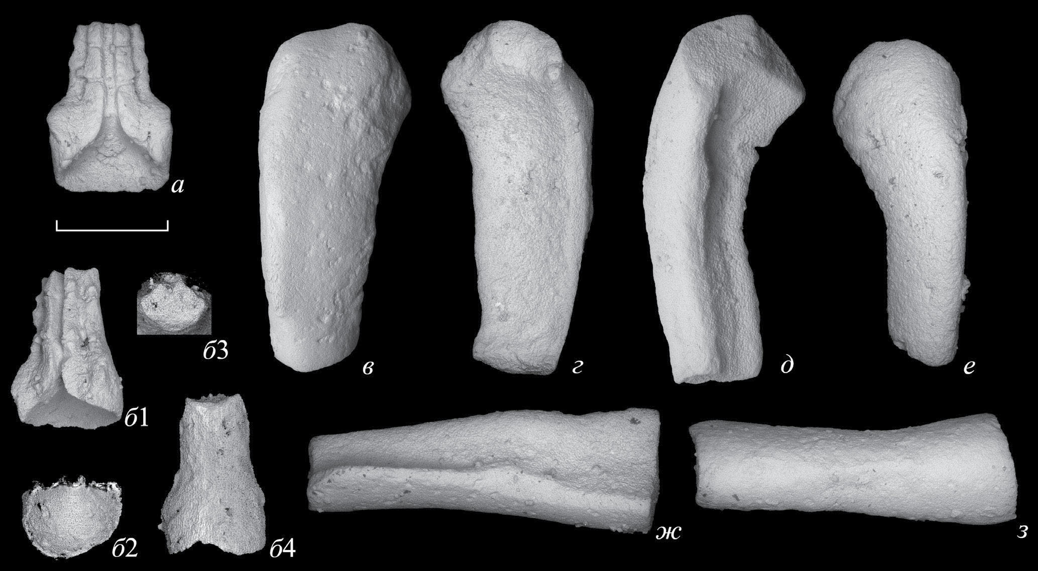Рис. 7. Phyllocystis cellularis sp. nov., разрозненные стилоконы и таблички из местонахождения в устье р. Лынна: а – стилокон, экз. ПИН, № 4125/1040; б – самый маленький из стилоконов в коллекции, экз. ПИН, № 4125/1048: б1 – вид с дорсальной стороны, б2 – вид с проксимальной стороны, б3 – вид с дистальной стороны, б4 – вид с вентральной стороны; в–е – вторые маргинальные таблички: в – экз. ПИН, № 4125/1042, г – экз. ПИН, № 4125/1041, д – экз. ПИН, № 4125/1043, е – экз. ПИН, № 4125/1044; ж, з – маргинальные таблички неустановленного положения: ж – экз. ПИН, № 4125/1045, з – экз. ПИН, № 4125/1047. Длина масштабной линейки – 1 мм.