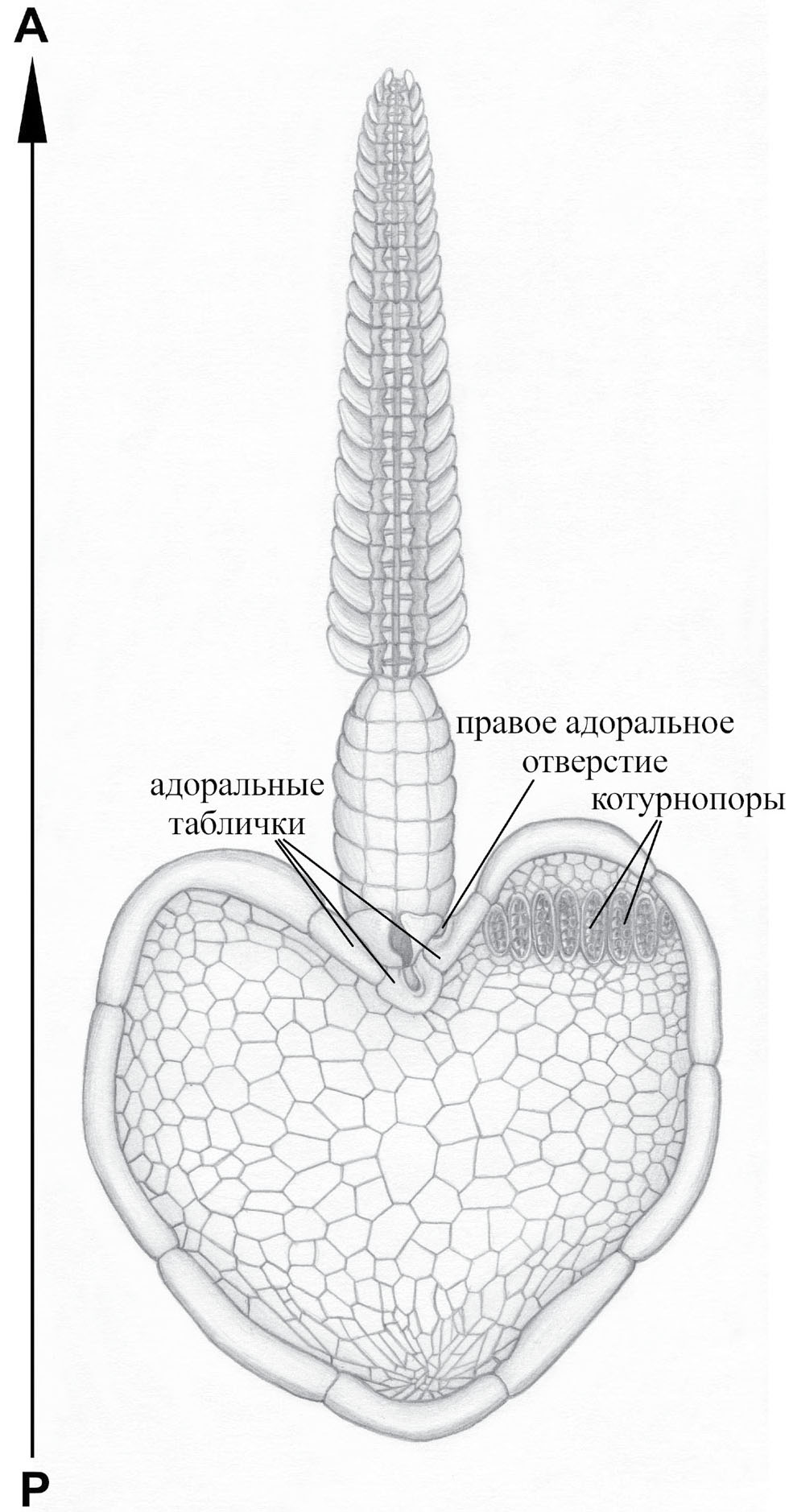 Рис. 8. Реконструкция стилофоры рода Phyllocystis с обозначением переднезадней оси и положения правого адорального отверстия (по: Рожнов, 2018, с изменениями).