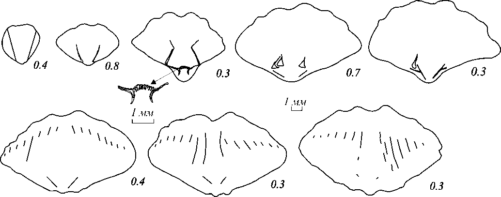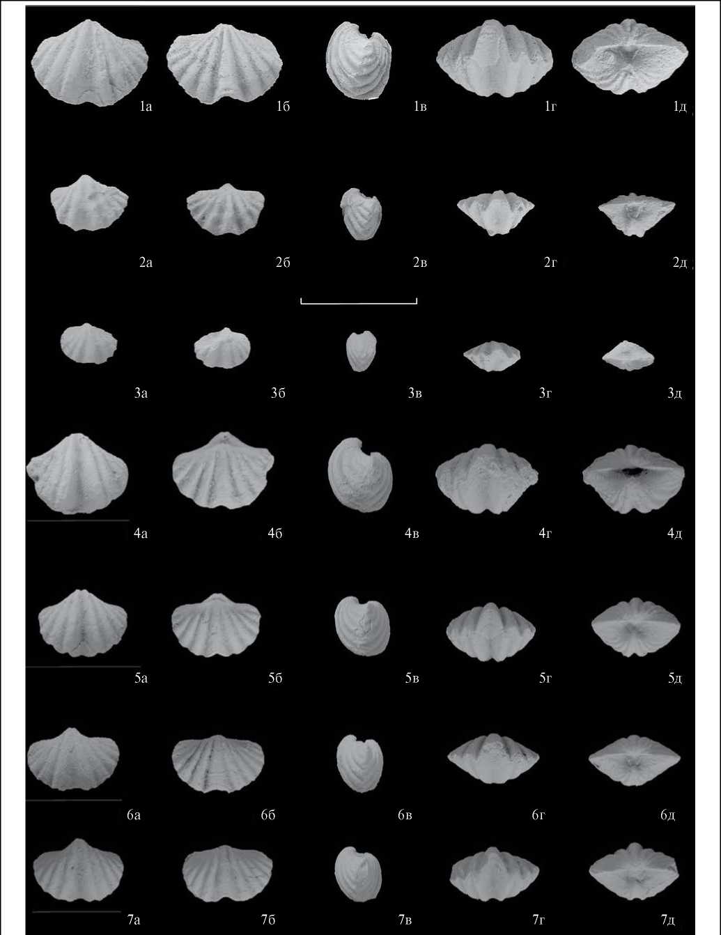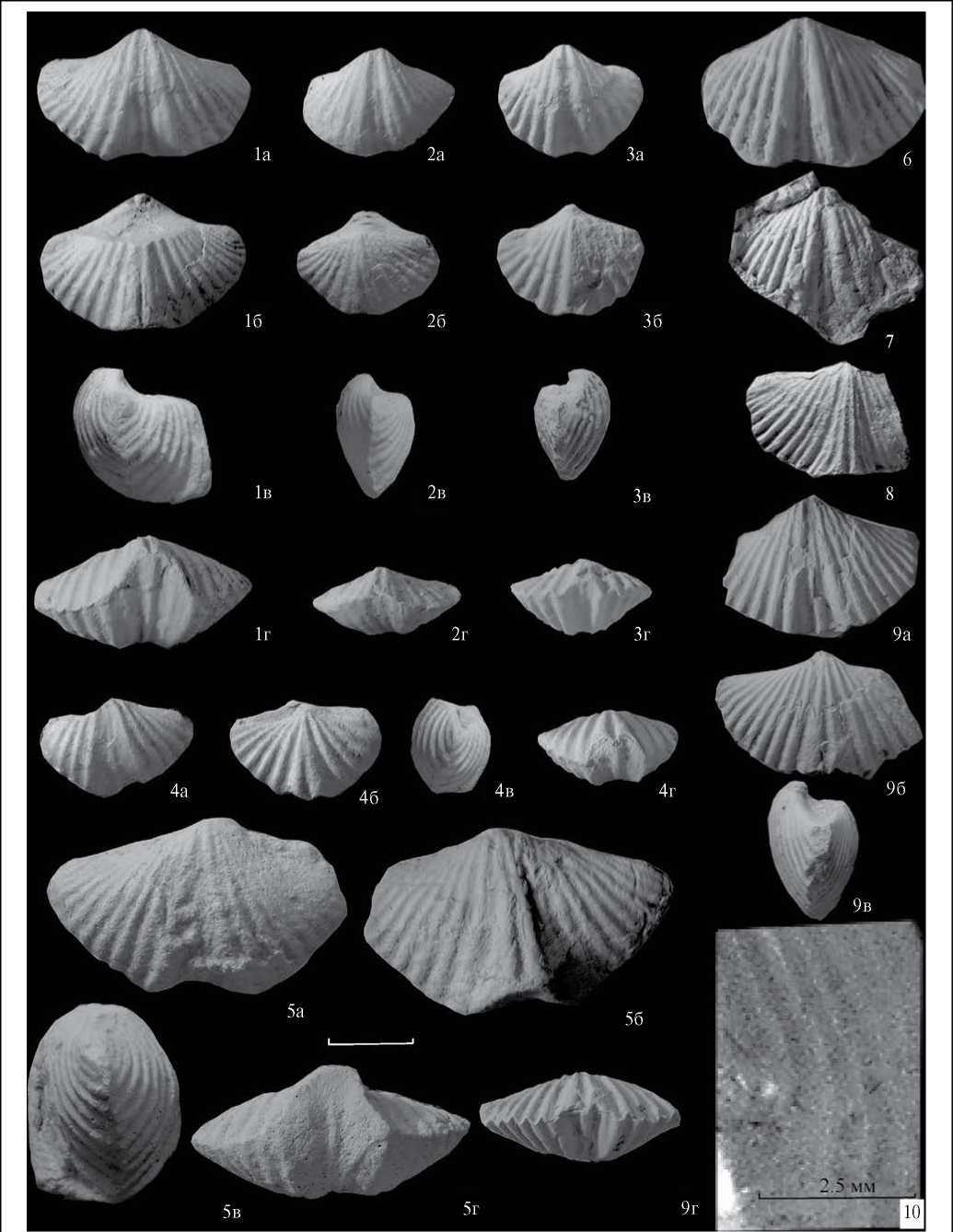 Описание (рис. 5). Раковина среднего размера, овальная, двояковыпуклая, поперечно-вытянутая, с наибольшей шириной и толщиной около середины. Передняя комиссура антипликатная. Брюшная створка умеренно выпуклая, с наибольшей толщиной в задней половине. Макушка высокая, слабозагнутая. Арея высокая, треугольная, вогнутая, апсаклинная. Синус, начинающийся от макушки, ограничен двумя крупными ребрами. На дне синуса расположено более крупное срединное ребро, которое у взрослых экземпляров начинается от макушки. Язычок трапециевидный с выемкой в средней части. Спинная створка более выпуклая, чем брюшная, с наибольшей толщиной в задней половине. Седло низкое, плоское, двураздельное. Боковые ребра, как правило, простые, округлые, только у одного экземпляра на спинной створке наблюдалась дихотомия некоторых боковых ребер. С каждой стороны от синуса и седла расположено шесть–девять ребер. Ширина межреберных промежутков равна ширине ребер. Микроскульптура представлена рассеянными на всей поверхности основаниями тонких игл (табл. VIII, фиг. 10).